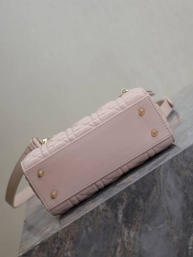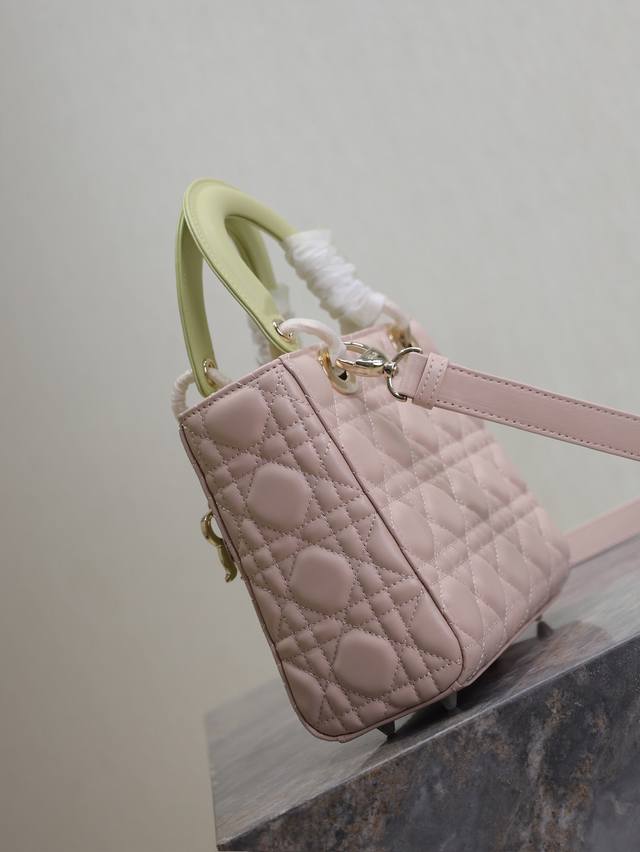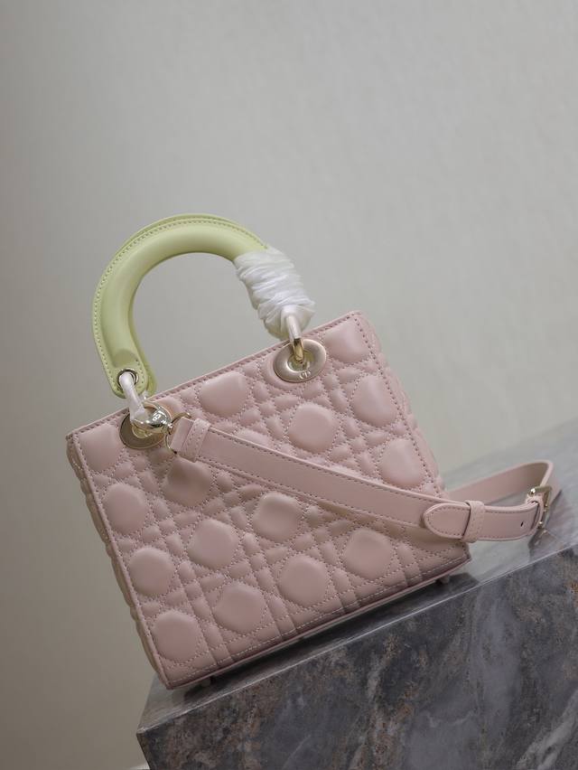 Authentic Lady Dio.R Pink and Light Yellow Four-Compartment Lambskin Adjustable Shoulder Strap This handbag embodies Dio.R's profound insight into elegance and beauty. Crafted from lambskin leather with quilted details in the signature cannage stitch, its elegant and classic design is timeless. Adorned with a light gold Dior hardware pendant, it features a velvet lining, an adjustable shoulder strap, and an interior zip pocket. It can be carried by hand, over the shoulder, or crossbody. Dimensions: 20 x 16.5 x 8 cm. Model: 0531