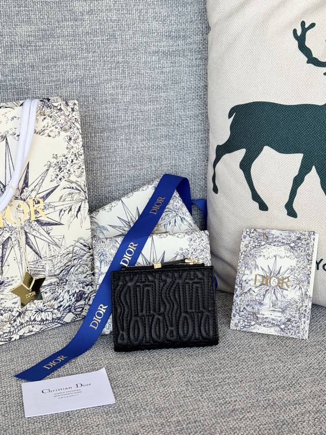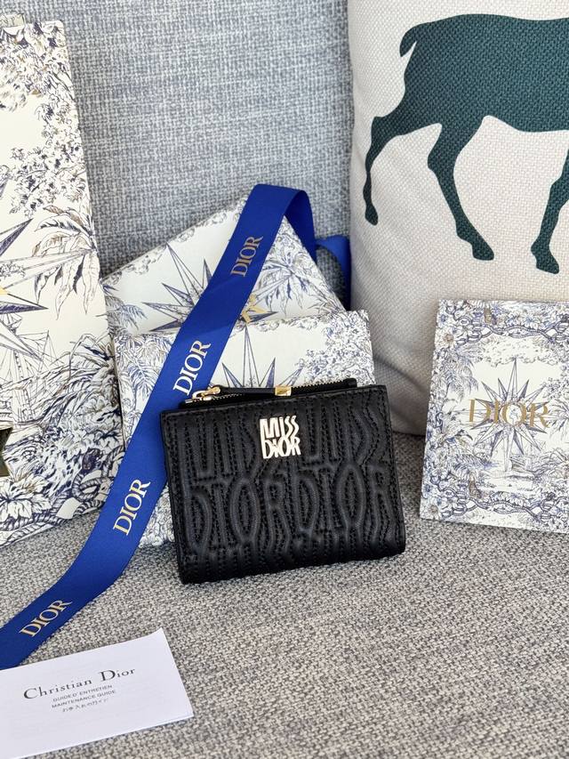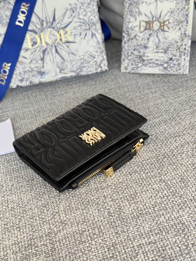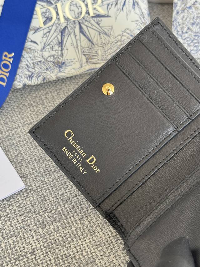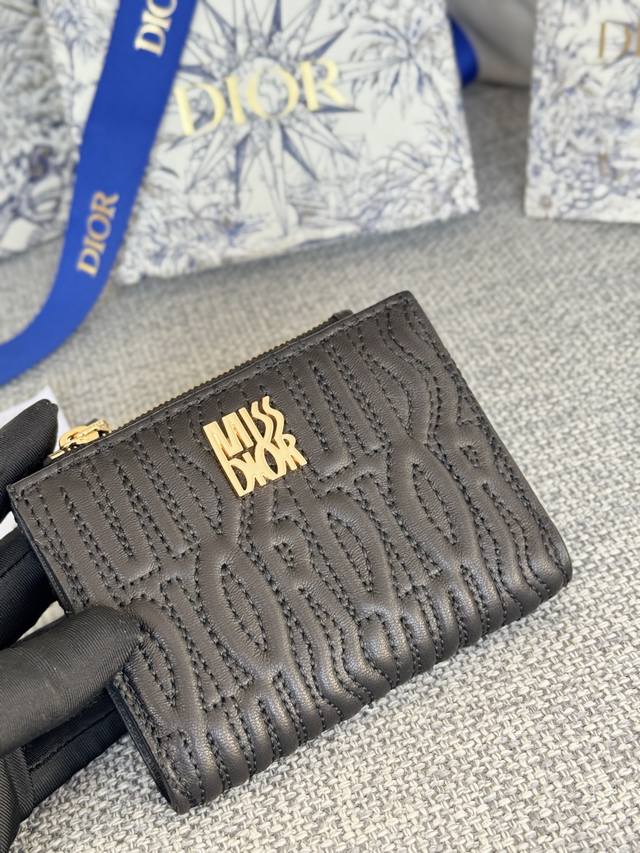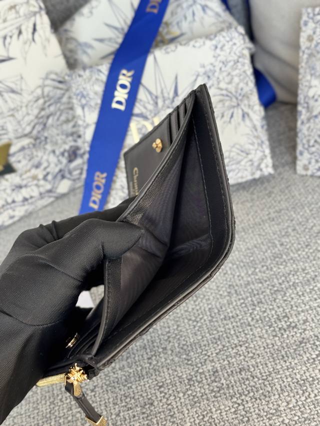 Lining: Lambskin leather, technical fabric Front: Miss Dior logo 6 card slots 4 card slots 1 cash compartment 1 zip pocket