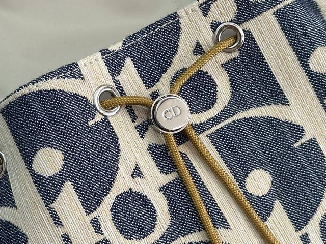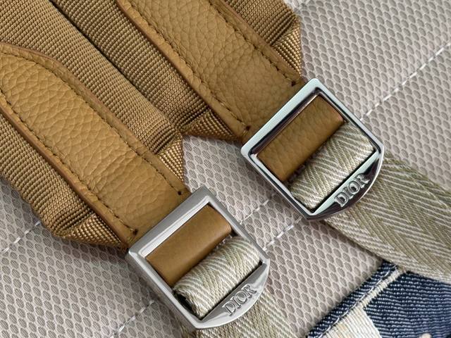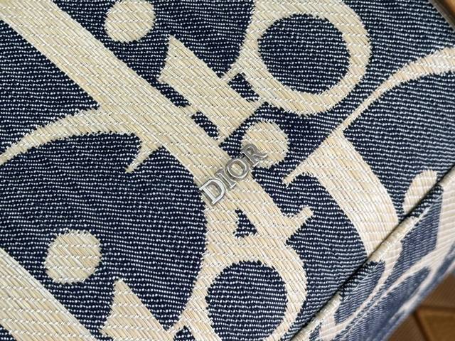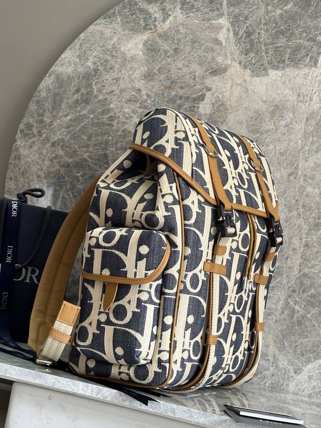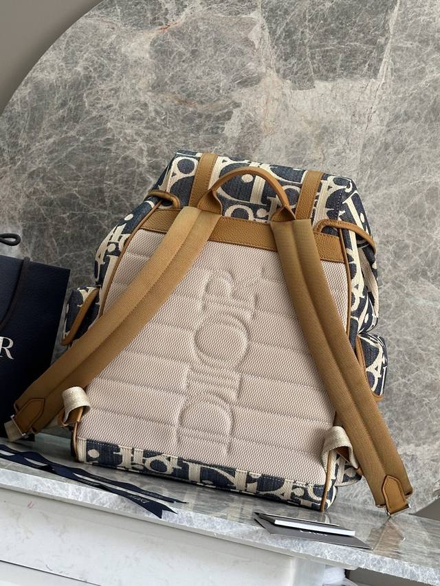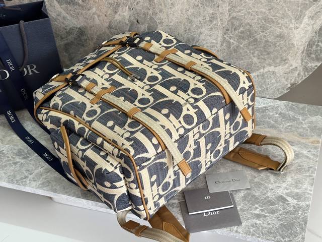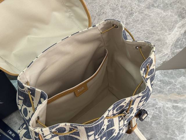This Dior Hit The Road backpack with flap combines modern style with Dior's couture spirit. Crafted from raffia-effect oblique-print denim, it features blue jacquard embroidery and contrasting beige stitching, reinterpreting the iconic Dior logo. Detailed with brown grained calfskin leather, the flap features a mini aluminum CD buckle and two chevron-patterned straps. It features a spacious main compartment and two side pockets with magnetic flaps. This practical design complements a variety of casual looks.