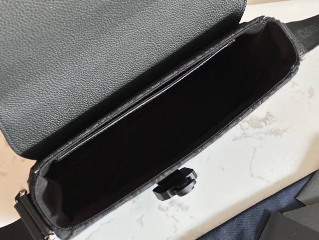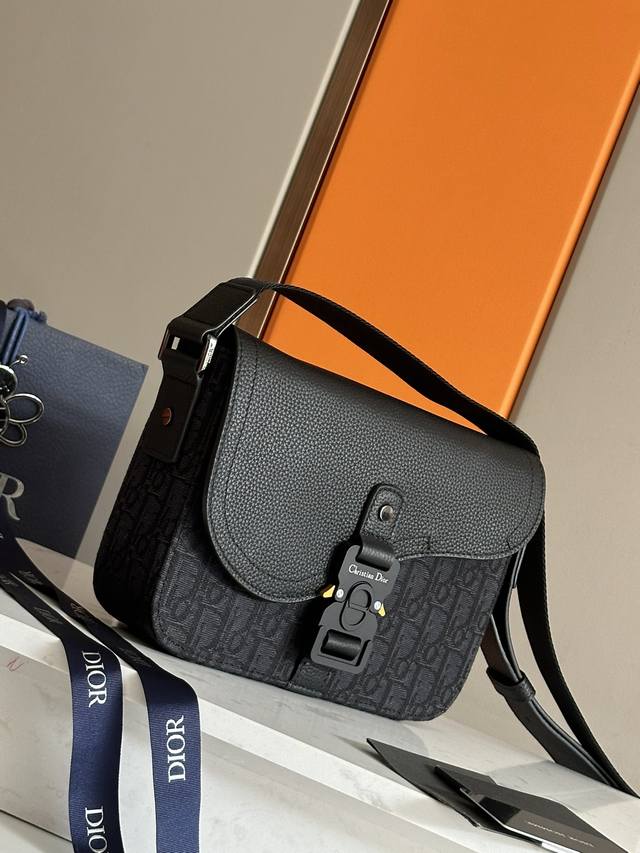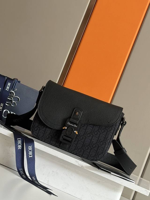 , top-quality original. This Saddle Messenger bag is a new arrival this season, exquisite and stylish. Expertly crafted from black grained cowhide leather with contrasting topstitching, it features a flap embellished with a saddle-inspired aesthetic and an aluminum buckle for added flair. This miniature style offers a spacious interior with a patch pocket for added sophistication, perfect for storing everyday essentials. The adjustable leather and Christian Dior jacquard strap allows for shoulder or crossbody wear.