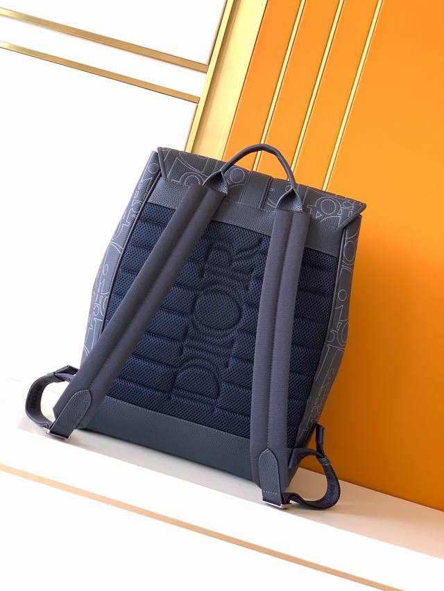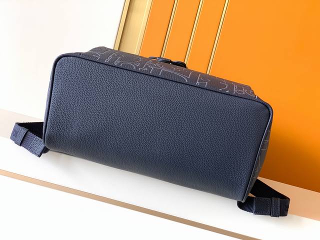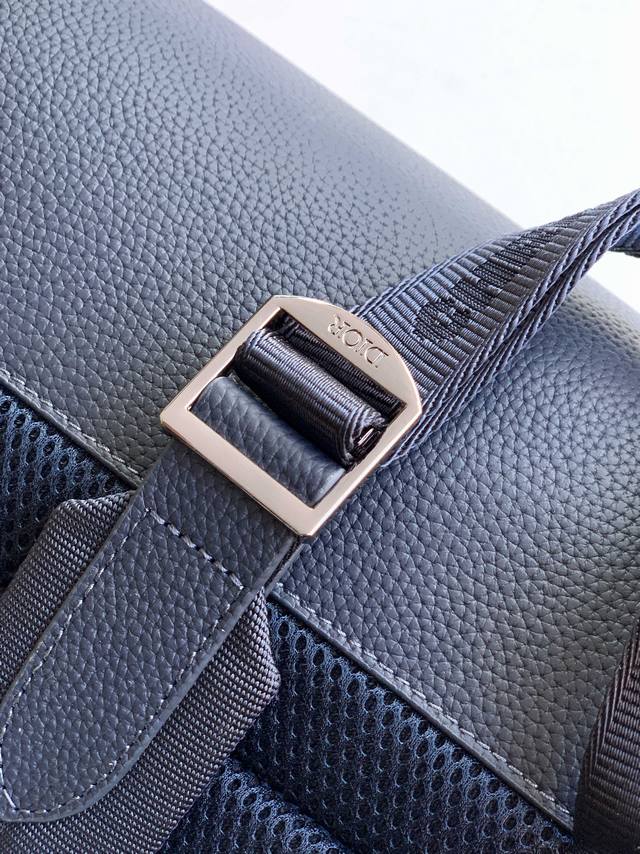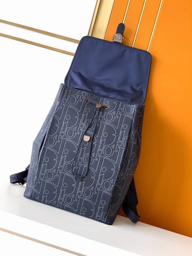 Backpack, 231 Blue Full Leather Embossed. This is the latest Dior saddle backpack from the official store, a runway style, original quality, made of luxurious black grained cowhide with an amazing feel. The front features leather panels adorned with the "Christian Dior" embossed logo on both sides. It has a front saddle pocket and two side pockets. The top has a flap closure with buckles. The design is novel, unique, stylish, elegant, and versatile. Perfect for street style and short trips. Dimensions: 32X41X16 DDD