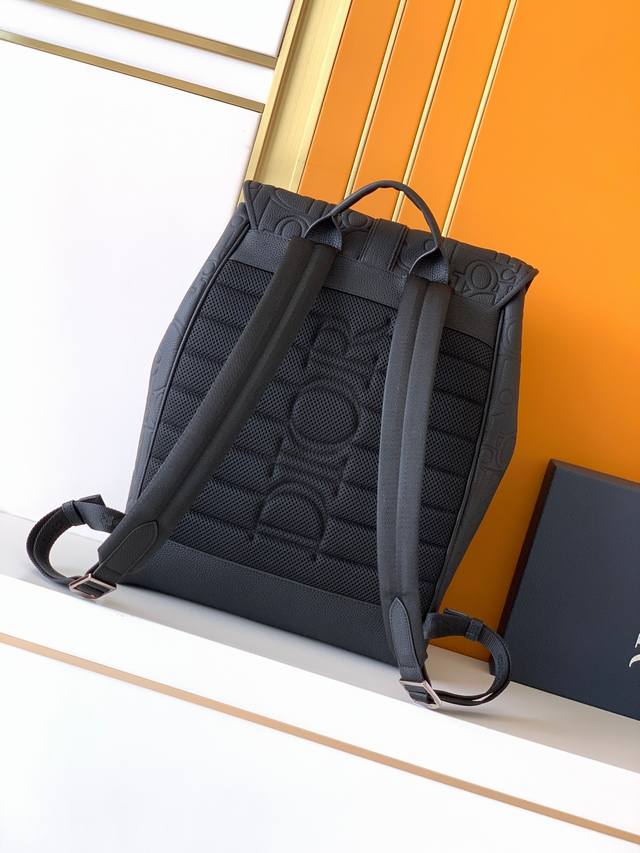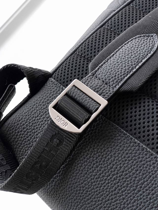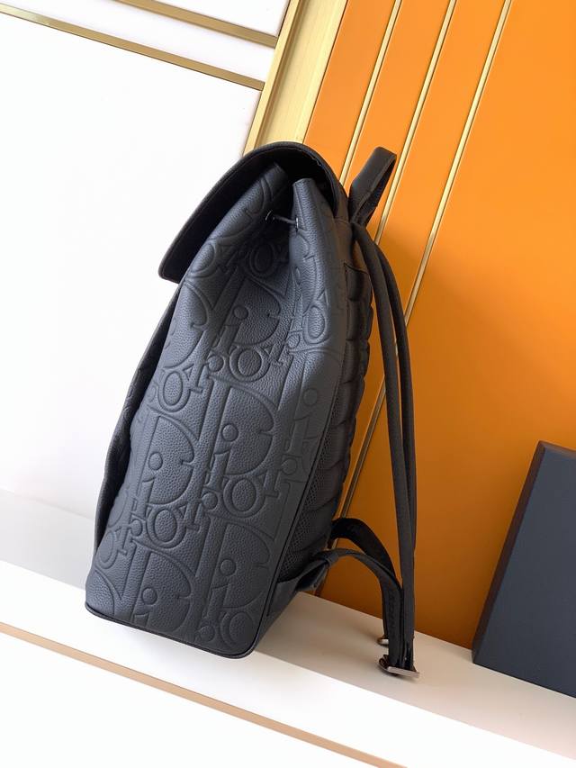 Backpack, D0231 Black Full Leather Embossed. This is the latest Dior saddle backpack from the official store, a runway style, original quality, made of luxurious black grained cowhide with an amazing feel. The front features leather panels adorned with the "Christian Dior" embossed logo on both sides. It has a front saddle pocket and two side pockets. The top has a flap closure with buckles. The design is novel, unique, stylish, elegant, and versatile. Perfect for street style and short trips. Dimensions: 32X41X16-DDDD