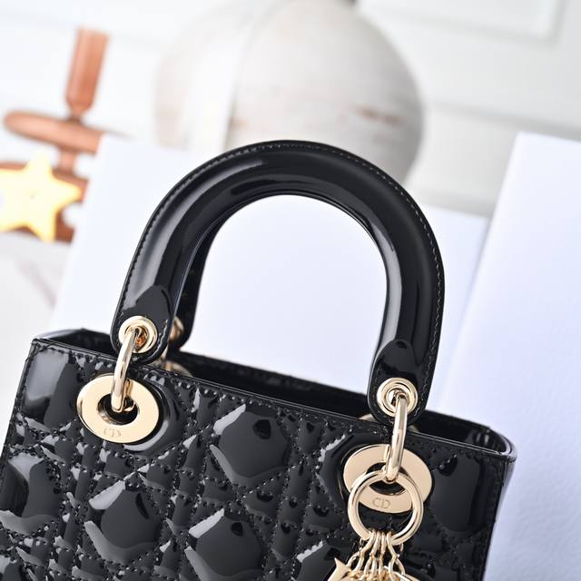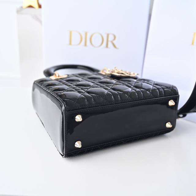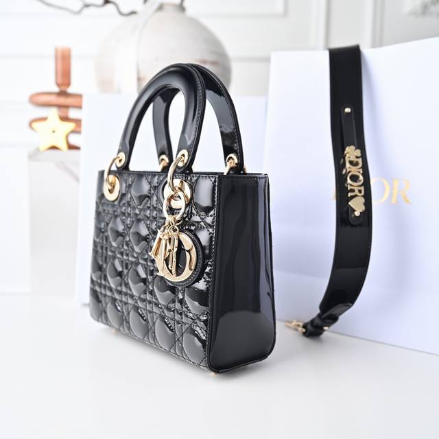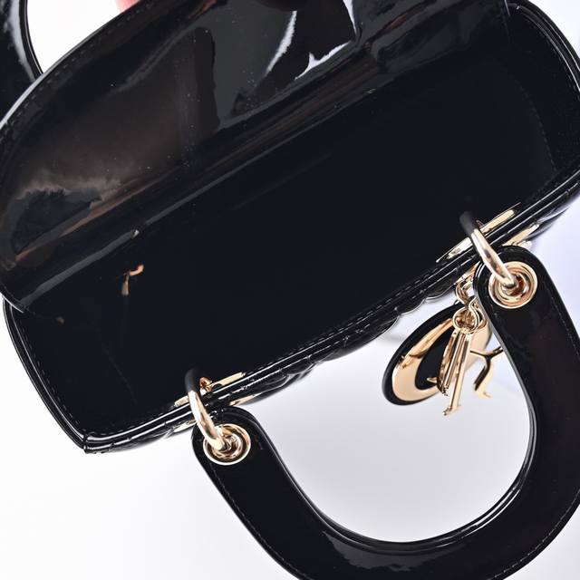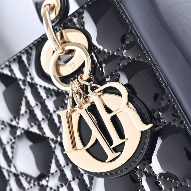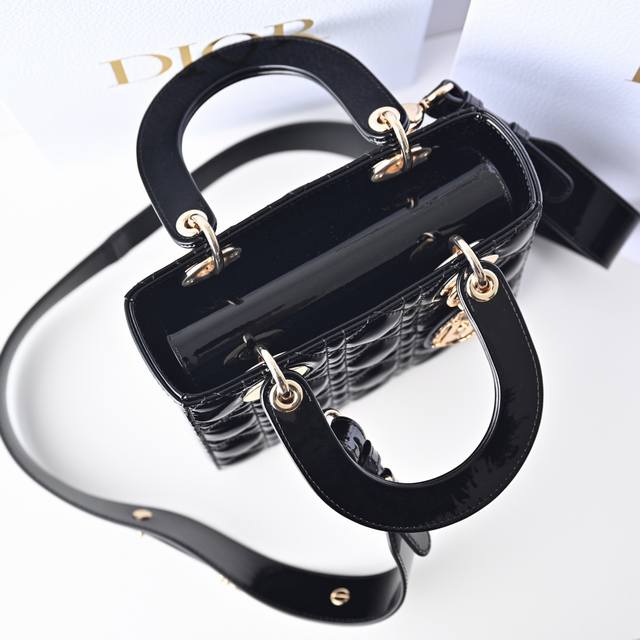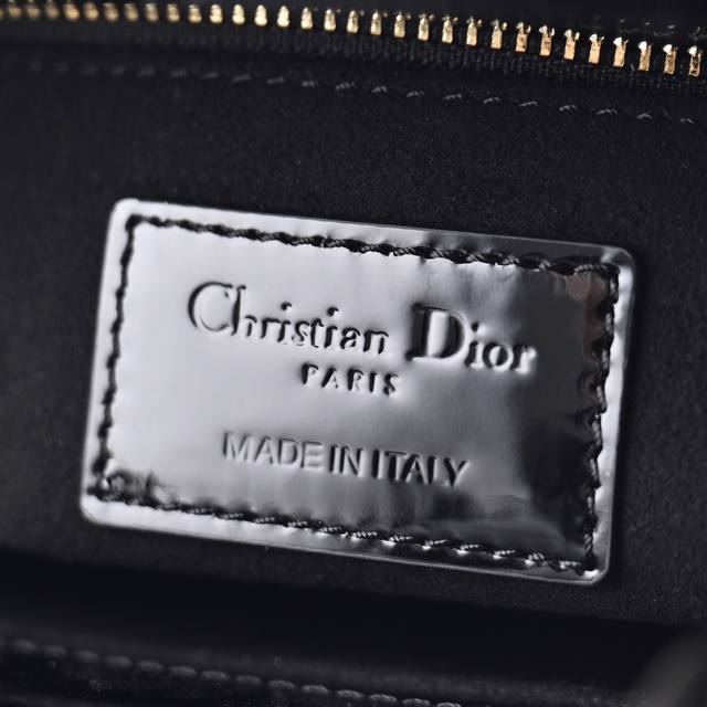 Black My Abcdior four-compartment patent leather cannage handbag with a customizable wide shoulder strap, comes with 6 badges, light gold-tone metal hardware, and a customizable wide shoulder strap adorned with Dior badges. Can be carried by hand, over the shoulder, or crossbody. Size: 20 x 16.5 x 8 cm