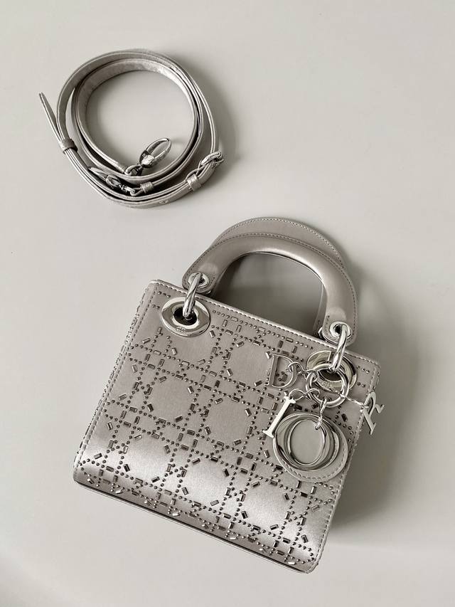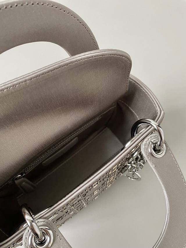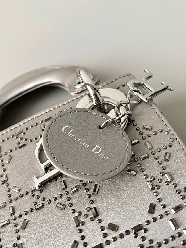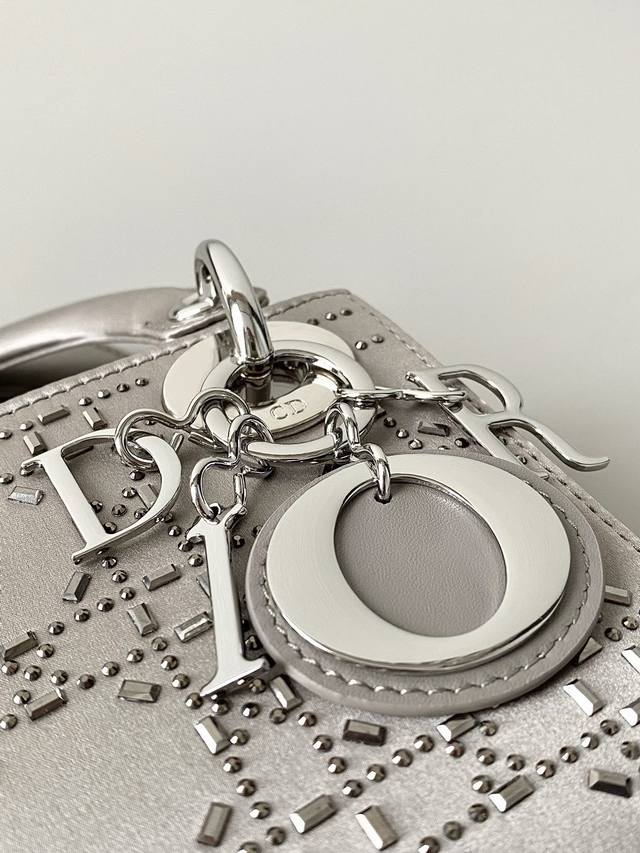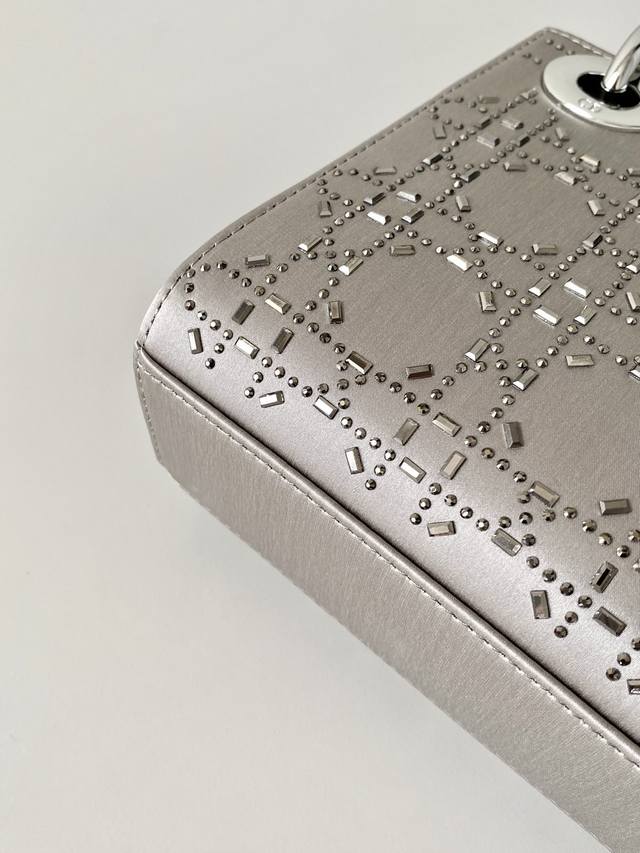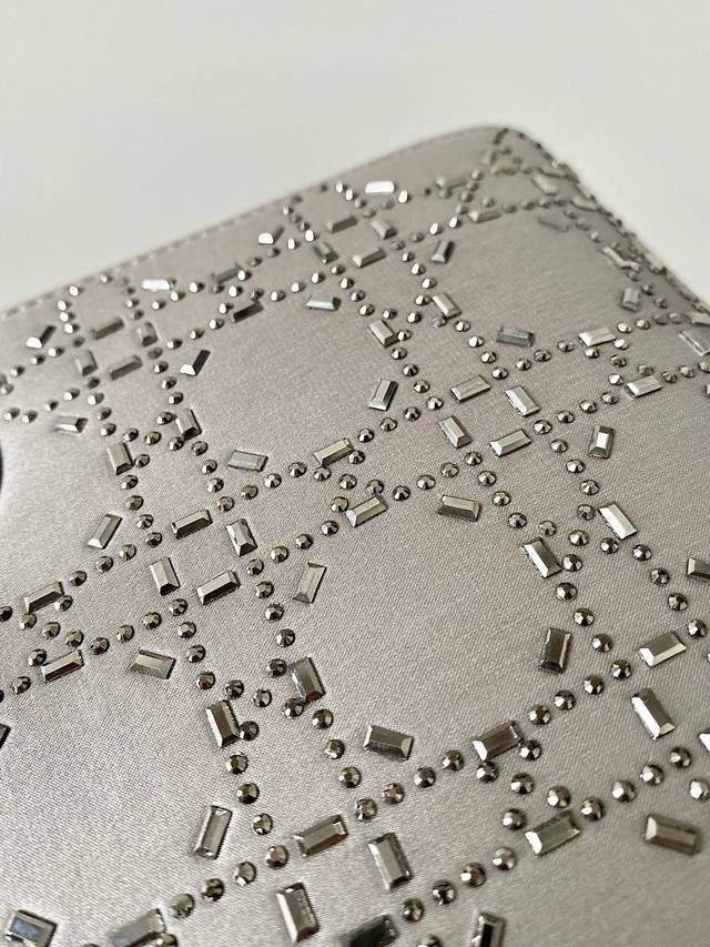 Dior Lady Dior Three-Compartment Bag, Silver-Grey Gunmetal Rhinestone Buckle. Three compartments, silk satin with rhinestones. Fully upgraded, the ultimate version! Imported silk with Swarovski crystal embellishments. Especially sparkling in low light. Has its own built-in lighting effect, truly stunning! A darling of elegance and sophistication, combining the charm of a socialite. A must-have for any Lady Dior bag collector!! Size: 17