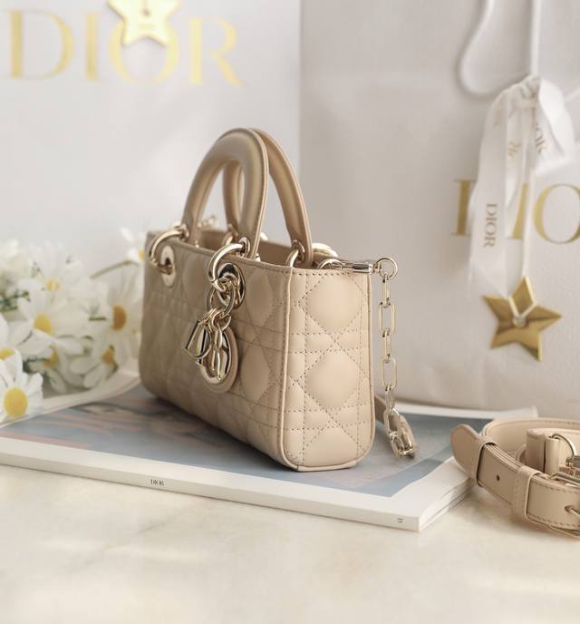 Ladyd-Joy handbag highlights the iconic neat aesthetic of the Lady Dior series and reflects Dior's profound insight into elegance and beauty. The style is refined and elegant, with quilted details created with cannage stitching. The "D1Or" pendant in light gold-finished metal enhances the style and adds a touch of agility to the exquisite silhouette. With a detachable chain shoulder strap and an adjustable and detachable technological canvas shoulder strap, it can be carried by hand, on the shoulder or crossbody, making it an ideal choice for everyday look.