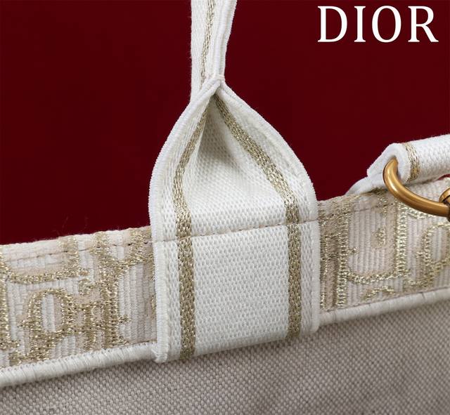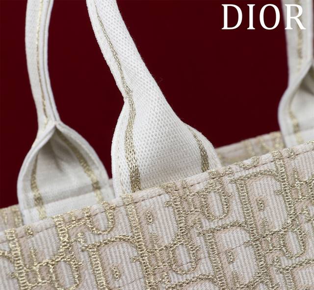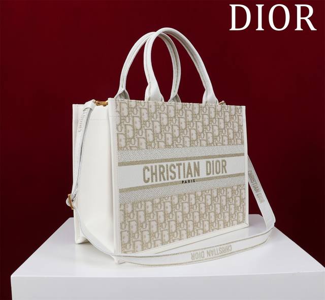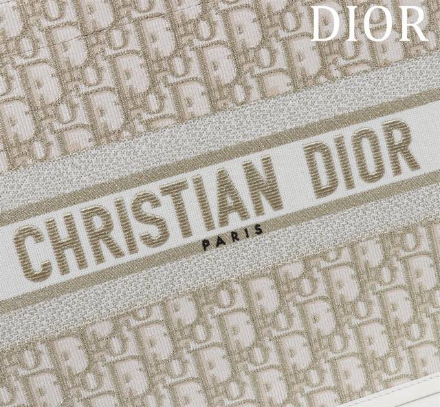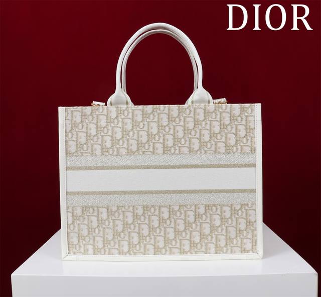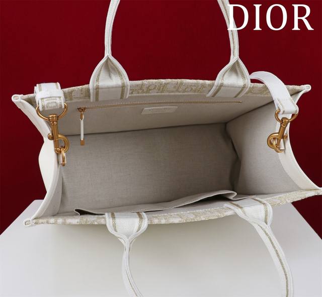 Dior New Tote Shoulder Strap Ddd 132407# Gold Thread D with Leather Ddd Size: Medium 36*28*16Cm DDD This Book Tote handbag elegantly interprets Maria Grazia Chiuri's classic style. Refined and elegant, it features an Oblique print, paired with gold metallic stitching and cream-colored calfskin leather, showcasing a fashionable style. The interior includes a zip pocket and multiple slip pockets for neatly storing various everyday items, while the Christian Dior Paris logo on the front enhances its sophistication. The practical medium size comes with an adjustable, detachable embroidered shoulder strap, highlighting Dior's exquisite craftsmanship, and can be carried by hand or over the shoulder. Material: Outer fabric: fabric, cowhide leather; Lining: fabric, cowhide leather; Front adorned with the Christian Dior Paris logo; Adjustable, detachable embroidered shoulder strap; Internal zip pocket; Two internal slip pockets; Includes dust bag.