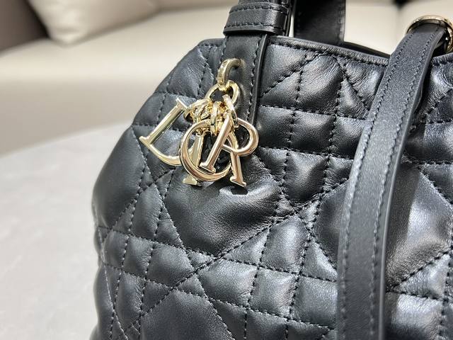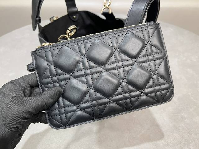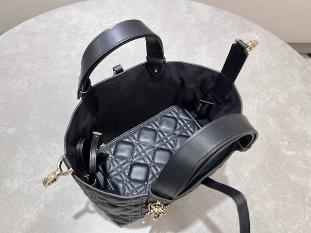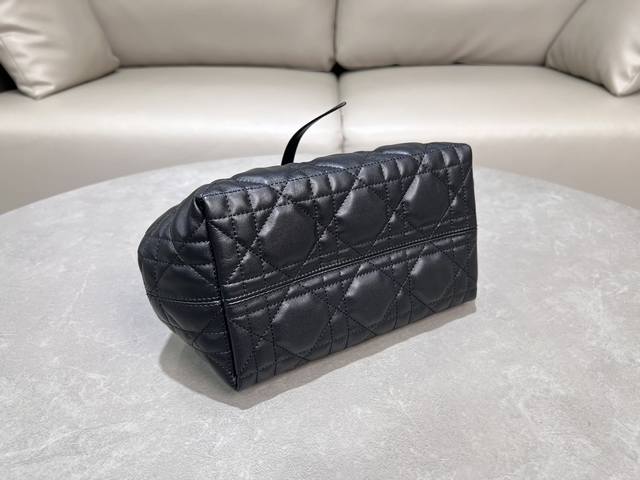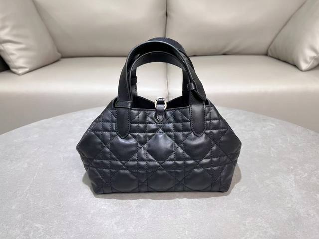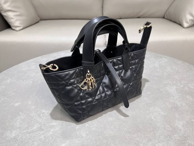 Factory Price. Top-quality original leather, top-grade original single item with complete boutique packaging. Small Dior Toujours Handbag. This Dior Toujours handbag made a stunning debut in the Spring/Summer 2023 collection, featuring a unique casual and practical design. Crafted from black calfskin leather with oversized cannage stitching, its spacious interior includes compartments and small pockets for neatly organizing everyday essentials. It features a leather drawstring closure for secure storage, and a Cd Lock dial closure with adjustable sides for added style. The small size includes an adjustable leather handle for hand or shoulder carrying. Dimensions: 23 x 15 x 15 cm. Code: 2822.