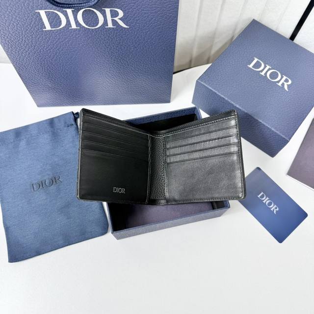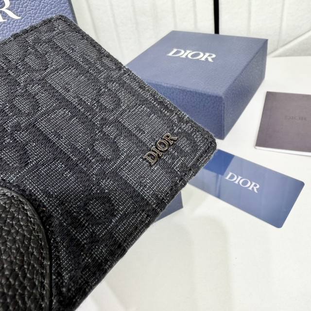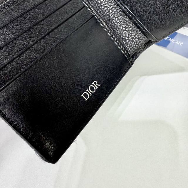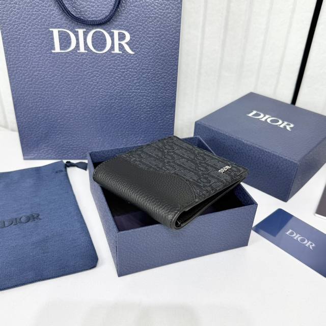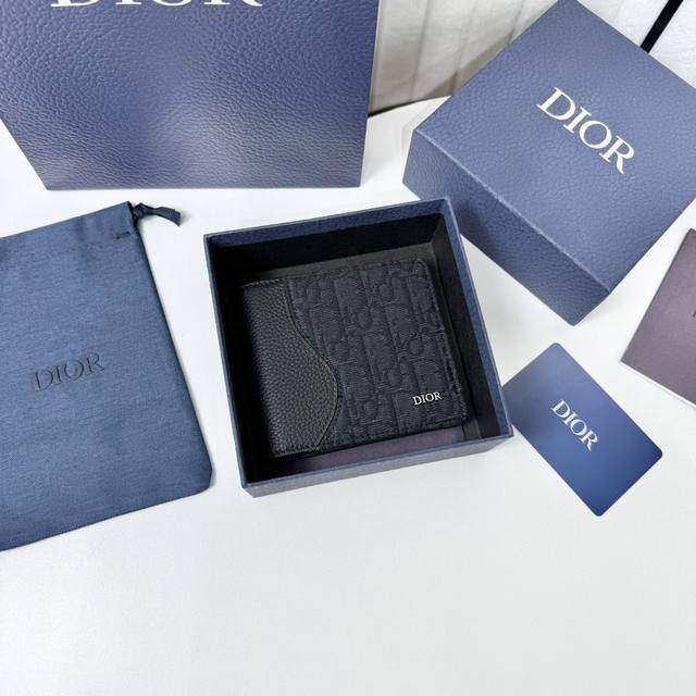 This bi-fold saddle wallet is an elegant accessory showcasing Dior's exquisite leather marquetry. Crafted from black grained cowhide leather and Oblique print fabric, it evokes the classic saddle silhouette and features a double cash compartment, two receipt pockets, and eight card slots. The bi-fold design, embellished with the Dior logo on the front, fits easily into any pocket or handbag.
