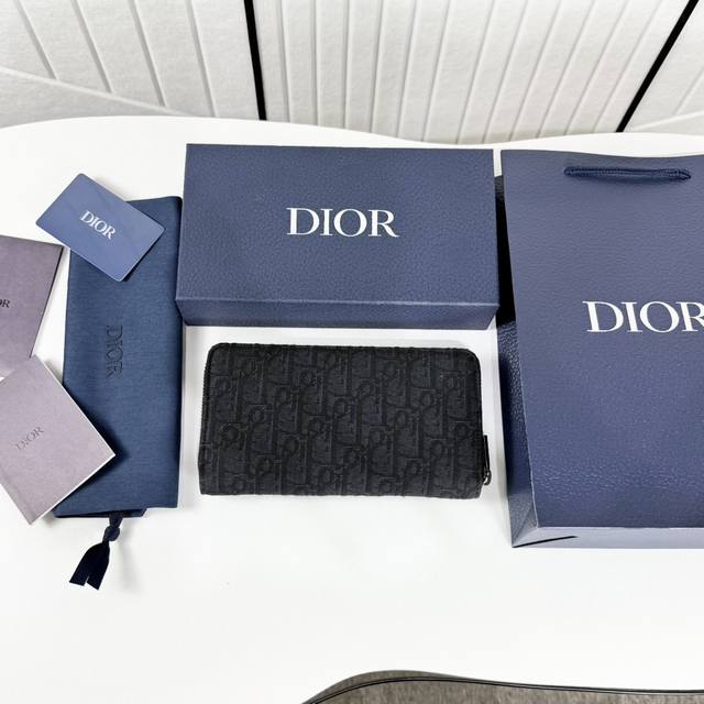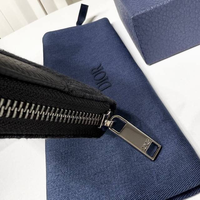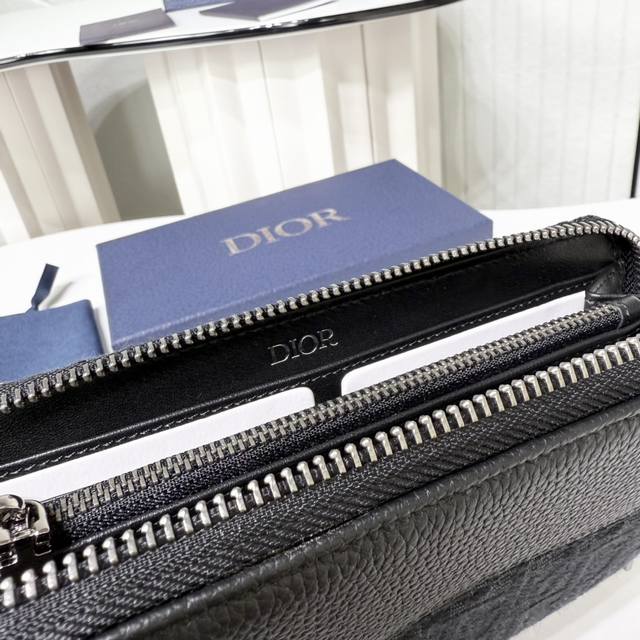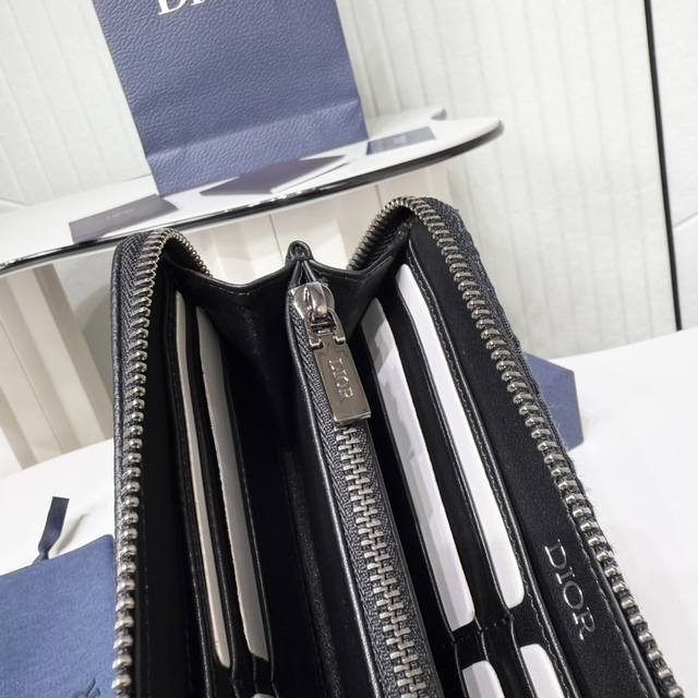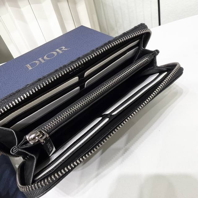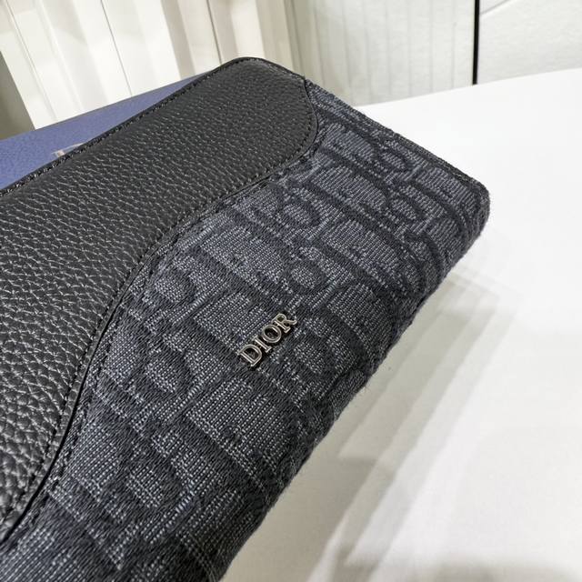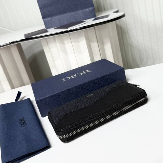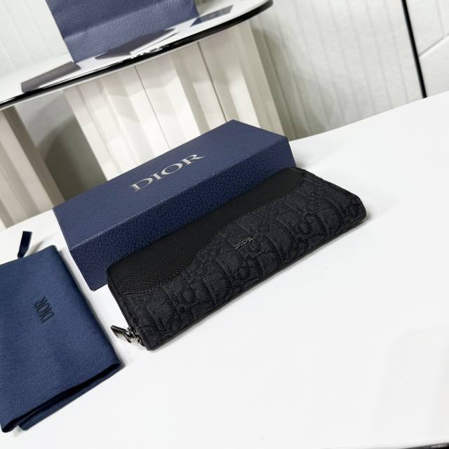 This Saddle Long Zip Wallet is understated yet elegant. Crafted from black inlaid grained cowhide leather and Oblique print fabric, it reinterprets the classic saddle shape, with the Dior logo displayed on the front for added flair. A central zippered compartment holds coins, while dual cash compartments and 12 card slots provide ample storage. Elegant and spacious, it's the ideal everyday companion.