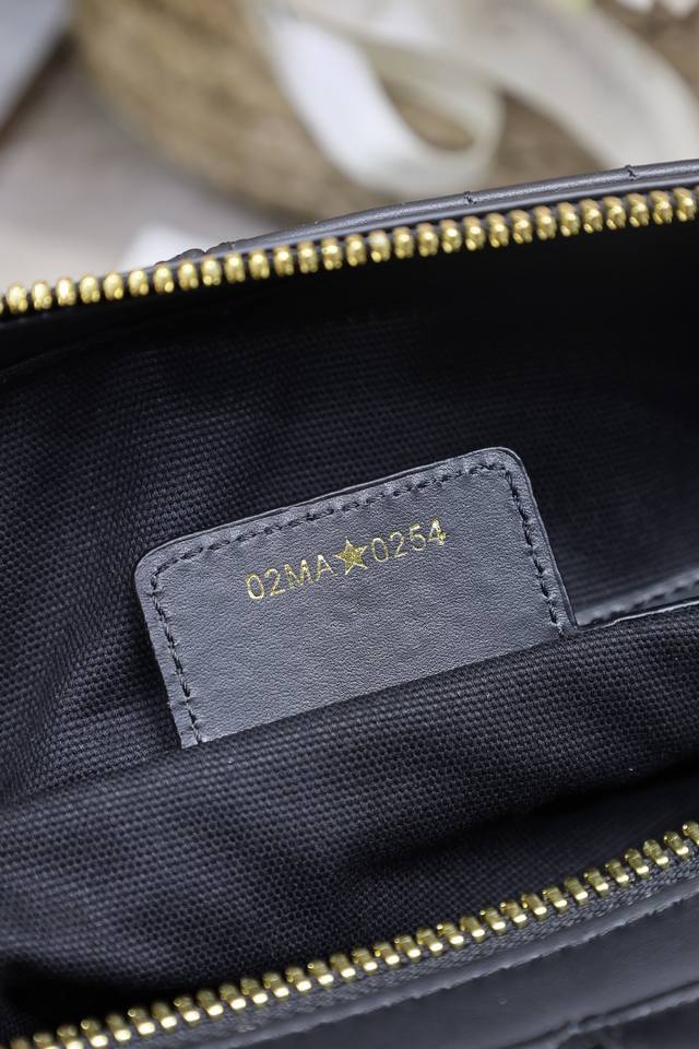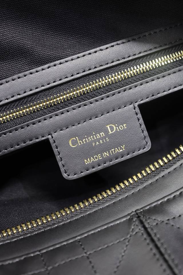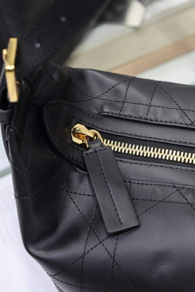 Medium D-Journey Handbag, Black Plain Weave. This D-Journey handbag is a new addition to the collection, making a stunning debut at the Dior Spring/Summer 2025 ready-to-wear show. Made of soft leather, it offers a modern interpretation of the dumpling bag silhouette. Crafted from black calfskin, it features flat, oversized cannage stitching, a fresh take on Dior's classic pattern. A zip pocket inside the main compartment adds a touch of sophistication, while two decorative side pockets with large leather zipper pulls adorned with the Christian Dior Paris logo. The medium size comes with an adjustable top leather handle and a leather shoulder strap, allowing for hand-carry, shoulder-carry, or crossbody wear