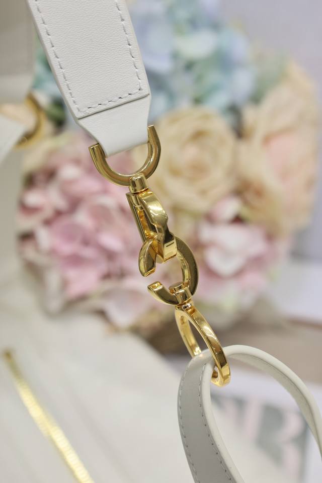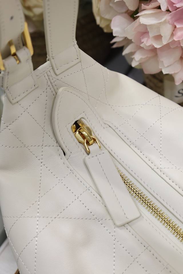 Medium D-Journey Handbag, White Plain Weave. This D-Journey handbag is a new addition to the collection, making a stunning debut at the Dior Spring/Summer 2025 ready-to-wear show. Made of soft leather, it offers a modern interpretation of the dumpling bag silhouette. Crafted from white calfskin, it features flat, oversized cannage stitching, a fresh take on Dior's classic pattern. A zip pocket inside the main compartment adds a touch of sophistication, while two decorative side pockets with large leather zipper pulls adorned with the Christian Dior Paris logo. The medium size comes with an adjustable top leather handle and a leather shoulder strap, allowing for hand-carry, shoulder-carry, or crossbody wear