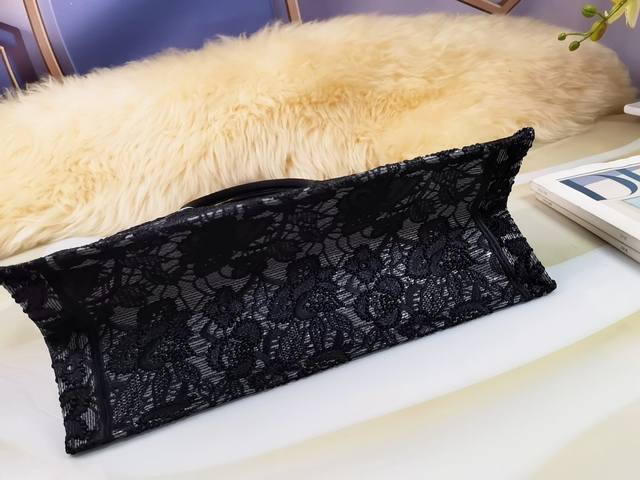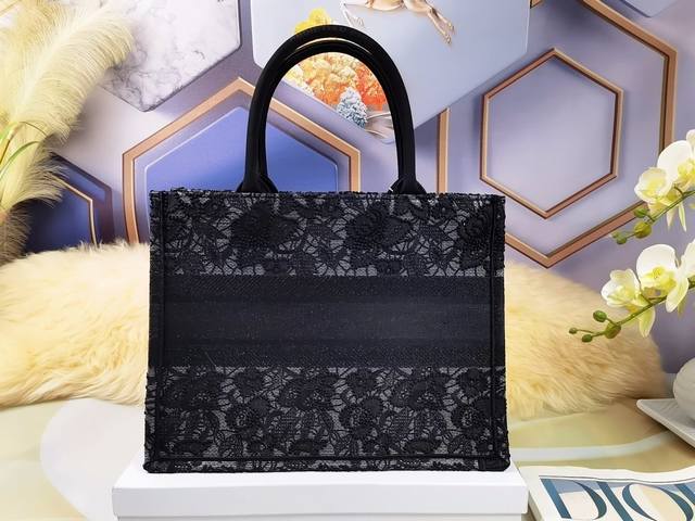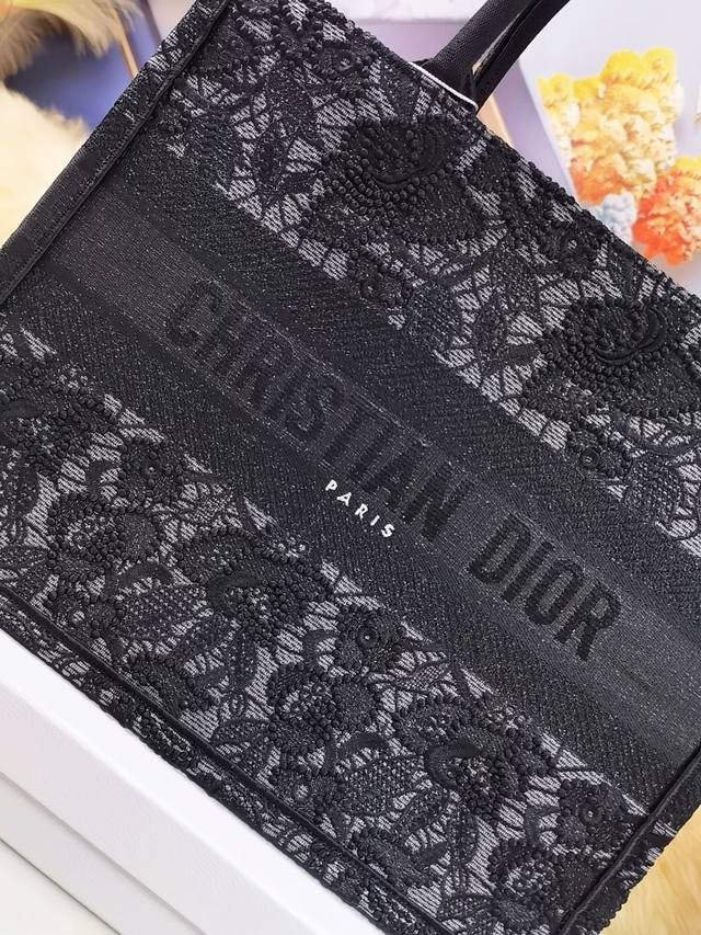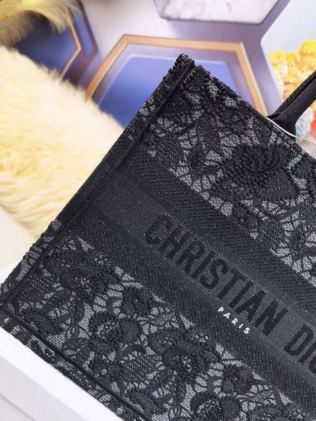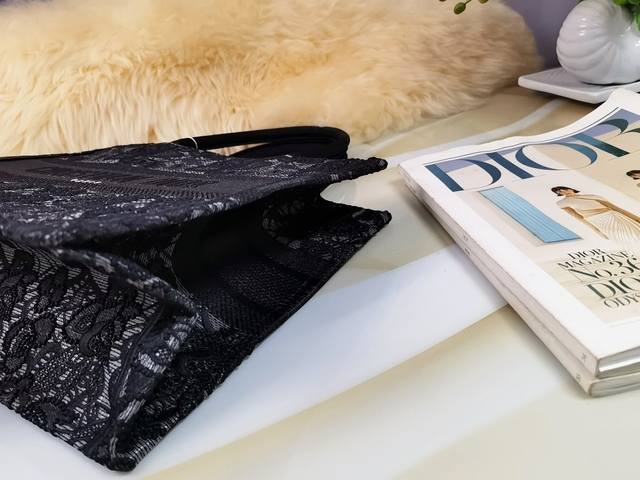 New Pattern Black Lace. Medium size 36.5X28X17.5 cm. Inspired by Maria Grazia Chiuri, Creative Director of Women's Collections, this Book Tote is a staple of Dior's aesthetics. It can hold all kinds of daily necessities and is embroidered with a white Macrame pattern by artist Pietro Ruffo all over, with the "Christian Dior" logo on the front. This bag embodies Dior's iconic craftsmanship and can be carried by hand or on the shoulder. "Christian Dior" logo on the front Dust bag included