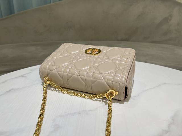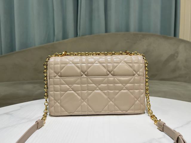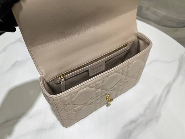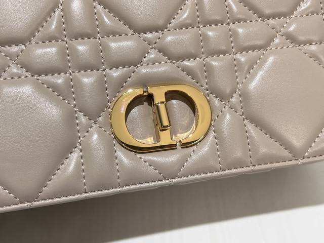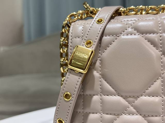 . This Soft Dior Caro handbag, a new addition to the Fall 2025 ready-to-wear collection, features a soft silhouette that blends modern flair with elegant charm. Crafted from luxurious apricot lambskin leather, it features oversized rattan-patterned topstitching. The flap is adorned with a vintage gold-finish metal knob-style Cd clasp, inspired by the closure of a Christian Dior perfume bottle. Small style with a detachable Cd chain link shoulder strap, which can be carried by hand, on the shoulder or crossbody, or replaced with a wide embroidered shoulder strap to enhance day or evening wear.