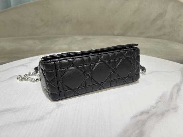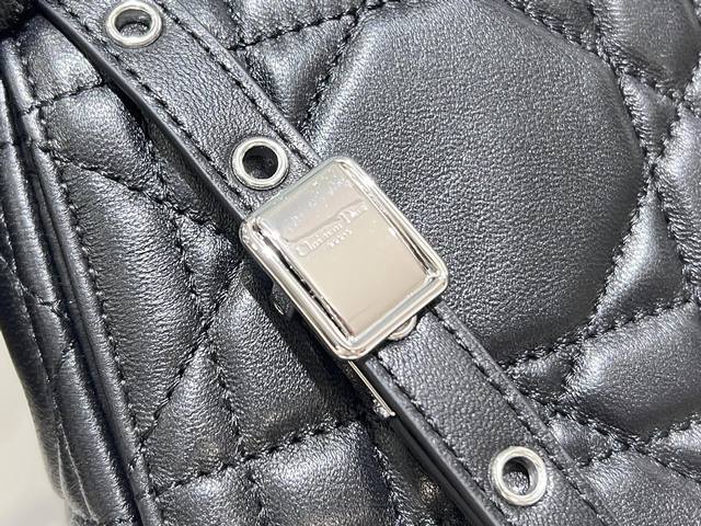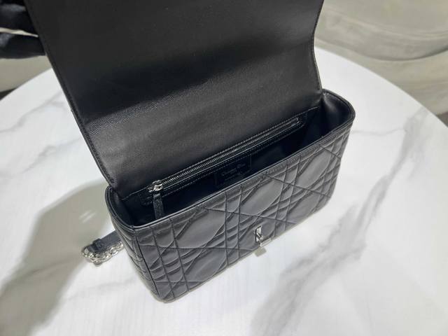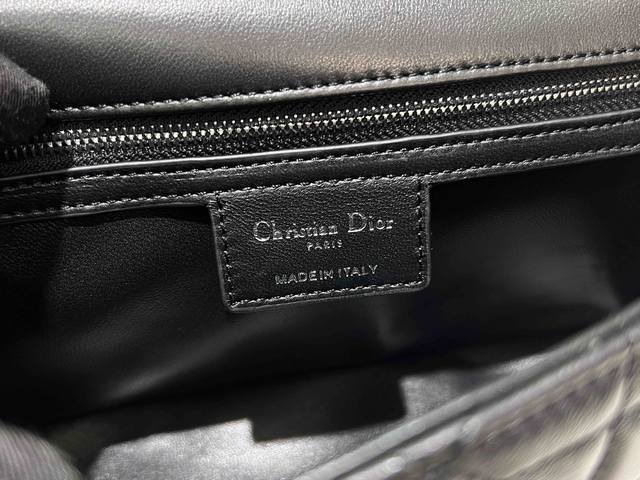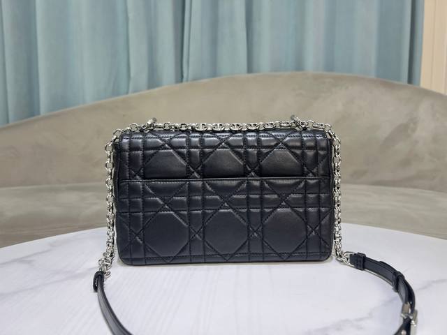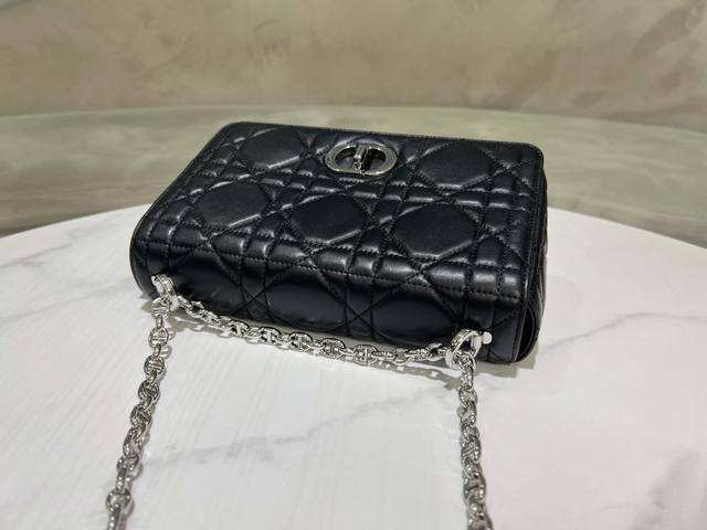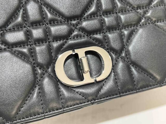 This Soft Dior Caro handbag, a new addition to the Fall 2025 ready-to-wear collection, features a soft silhouette that blends modern flair with elegant charm. Crafted from luxurious black lambskin leather, it's embellished with oversized rattan-patterned topstitching. The flap features a vintage gold-finish metal knob-style clasp, inspired by the closure of a Christian Dior perfume bottle. Small style with a detachable Cd chain link shoulder strap, which can be carried by hand, on the shoulder or crossbody, or replaced with a wide embroidered shoulder strap to embellish day or evening wear.