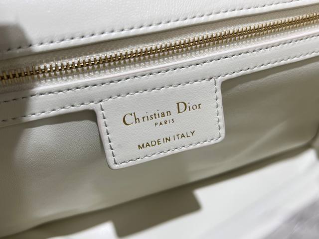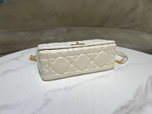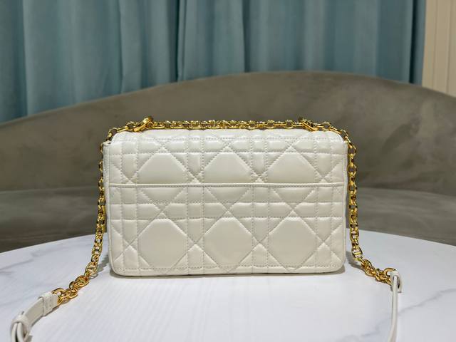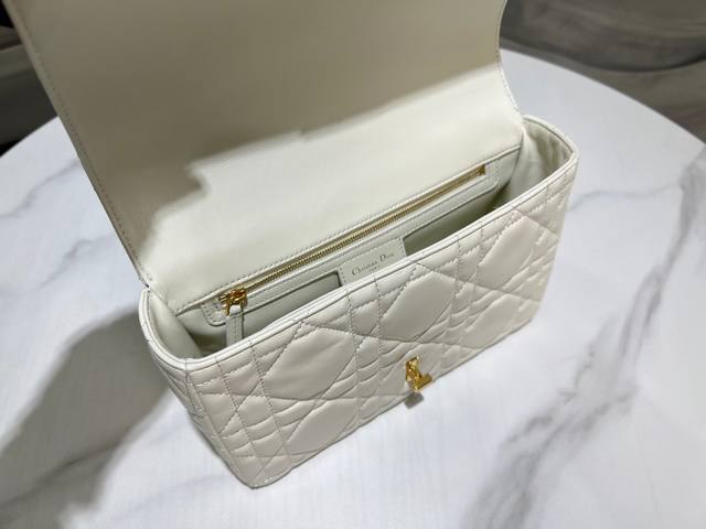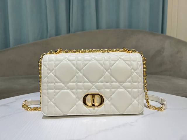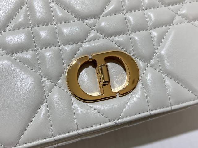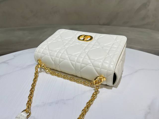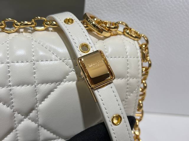 . This Soft Dior Caro handbag, a new addition to the Fall 2025 ready-to-wear collection, features a soft silhouette that blends modern elegance with timeless sophistication. Crafted from luxurious white lambskin leather, it features oversized Raglan topstitching. The flap is adorned with a vintage gold-finish metal knob-style Cd clasp, inspired by the closure of a Christian Dior perfume bottle. Small style with a detachable Cd chain link shoulder strap, which can be carried by hand, on the shoulder or crossbody, or replaced with a wide embroidered shoulder strap to embellish day or evening wear.