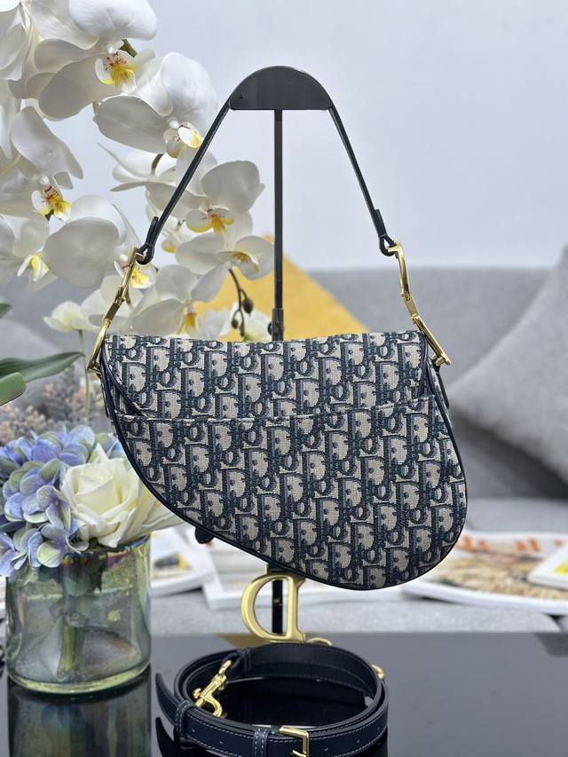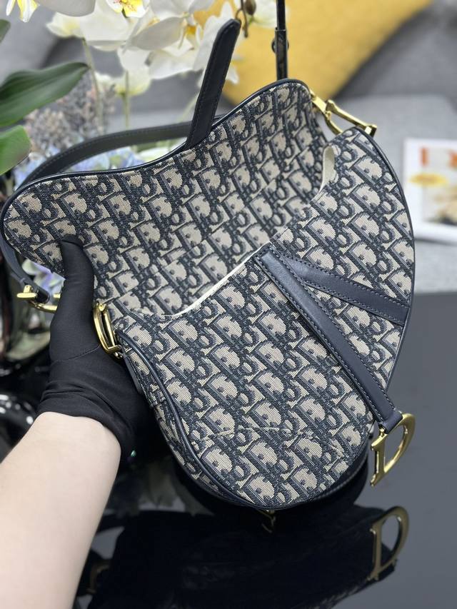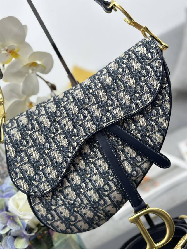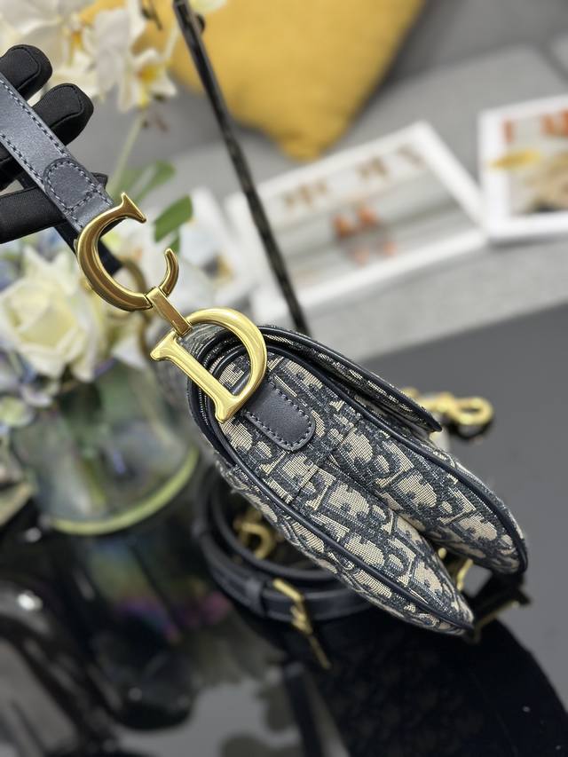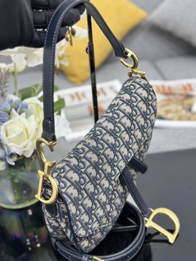 Saddle Bag, Large Canvas Blue, is more stylish and eye-catching. Following the traditional style, the stirrup "D" shaped magnetic clasp and saddle flap highlight the brand's classic design, while the handle features the " Cd" logo. The entire bag is adorned with blue Oblique print embroidery, paired with vintage gold-finish metal hardware, and the front is decorated with the "Christian Dior" logo. Fashionable and modern, it can be replaced with other shoulder straps for a more personalized look. Features include a stirrup "D" shaped magnetic closure, a "Cd" logo handle, an interior pocket, a back pocket, and can be carried by hand or over the shoulder. Dimensions: 25.5 cm x 20 cm x 6.5 cm, Model: M0446. Exclusive real-object photography, brand new packaging gift box, nationwide uniform price 80 DDD.