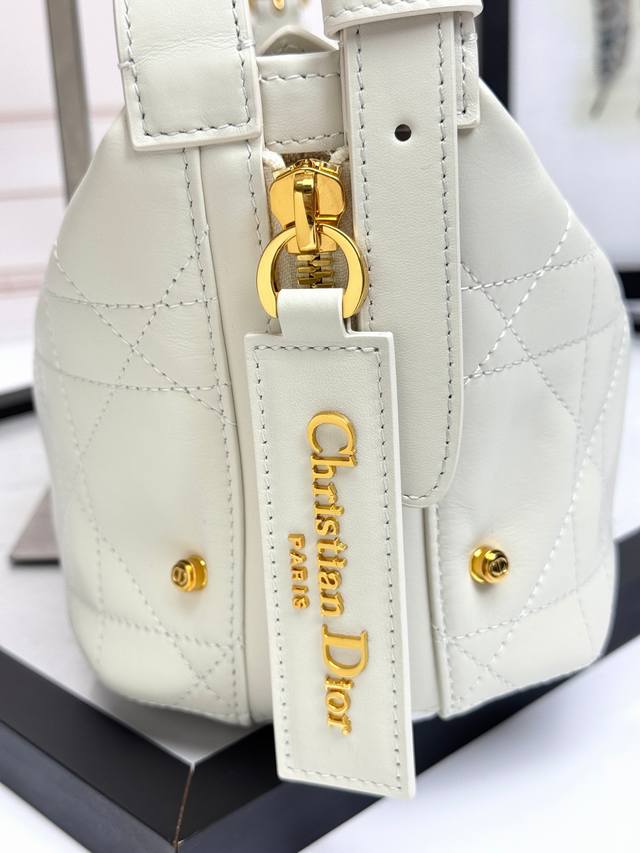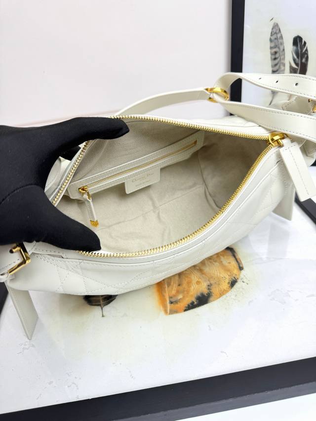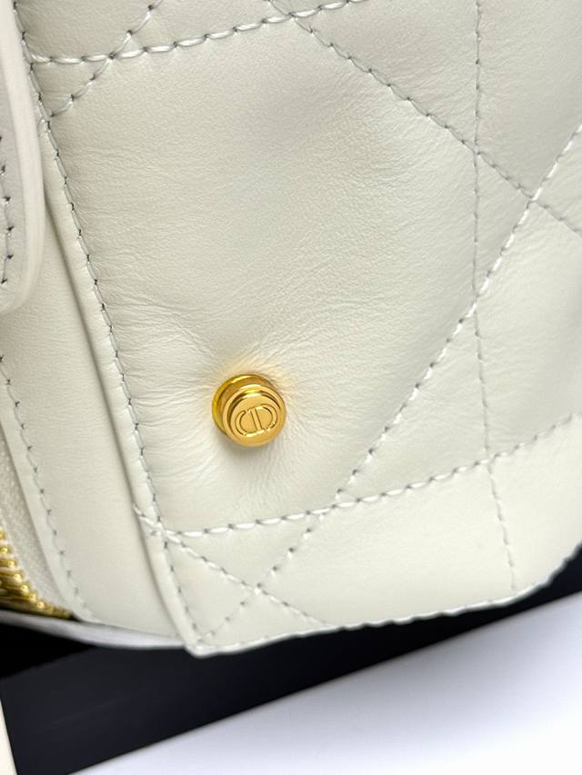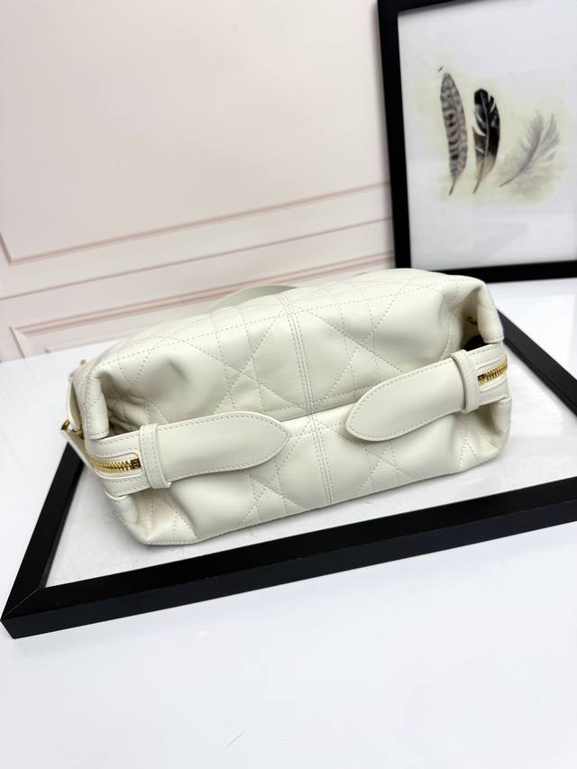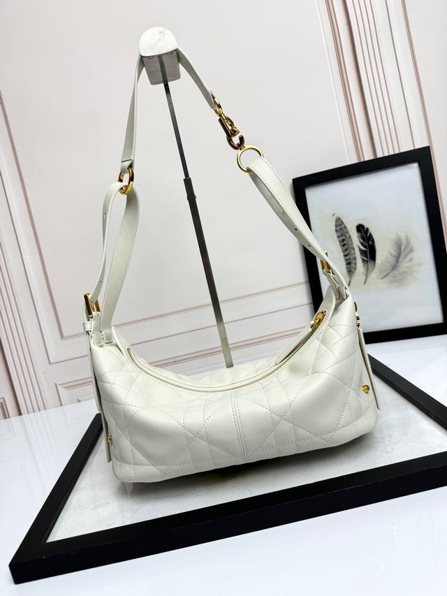 Small Plain White Dior Bag. Top-tier imported fabric, premium hardware, and imported stitching. This D-Journey handbag boasts a soft texture and a modern interpretation of the dumpling bag silhouette. Crafted from creamy white vintage smooth calfskin, it features flat, oversized cannage stitching, a fresh take on Dior's classic pattern. A zip pocket in the main compartment adds a touch of sophistication, while two decorative side pockets with large leather zipper pulls adorned with the Christian Dior Paris logo. The small size, with an adjustable leather top handle and leather shoulder strap, allows for hand-carrying, shoulder-carrying, or crossbody wear, making it ideal for everyday styling. Model: D2416, Size: 25.5 x 14.5 x 14 cm. Exclusive real-object photography 669820. Comes with original factory packaging gift box.