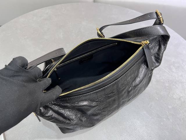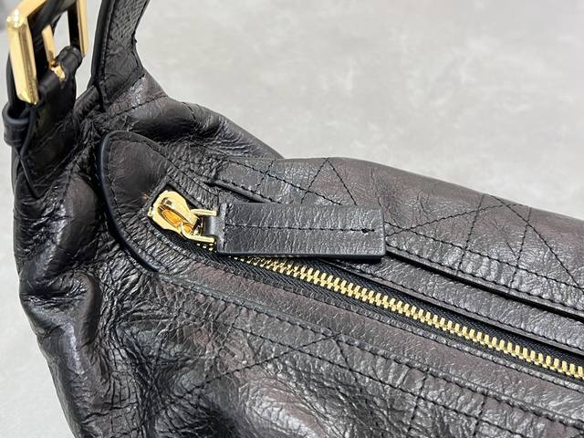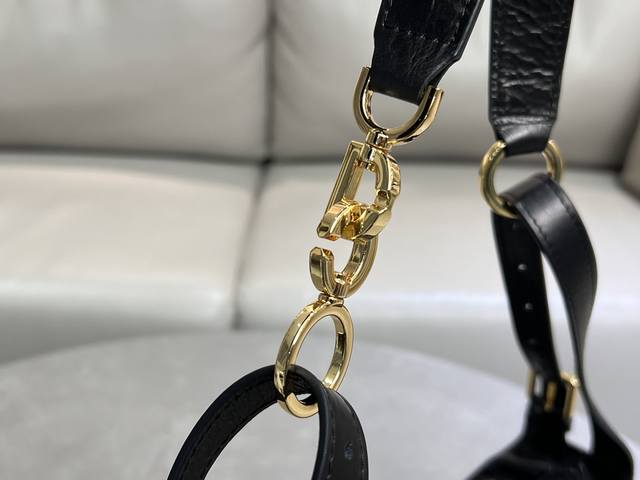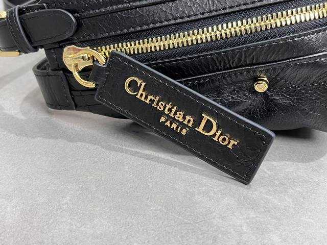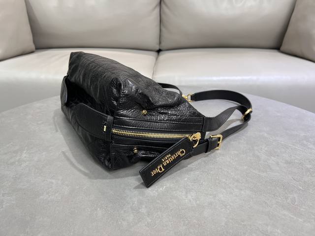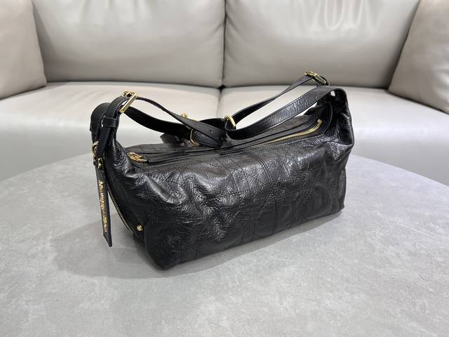 This D-Journey handbag is a new addition to the collection, making a stunning debut at the Dior Spring/Summer 2025 ready-to-wear show. It features a soft texture and a modern interpretation of the dumpling bag silhouette. Crafted from waxed calfskin, it's adorned with flat, oversized cannage stitching, a fresh take on Dior's classic pattern. The main compartment includes a zip pocket, while two side pockets feature large leather zipper pulls adorned with vintage gold-finished Christian Dior Paris logos, perfect for organizing small everyday essentials. The small size comes with an adjustable top handle and a leather shoulder strap, allowing for hand-carrying, shoulder-carrying, or crossbody wear
