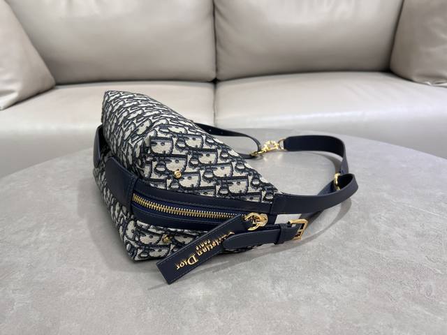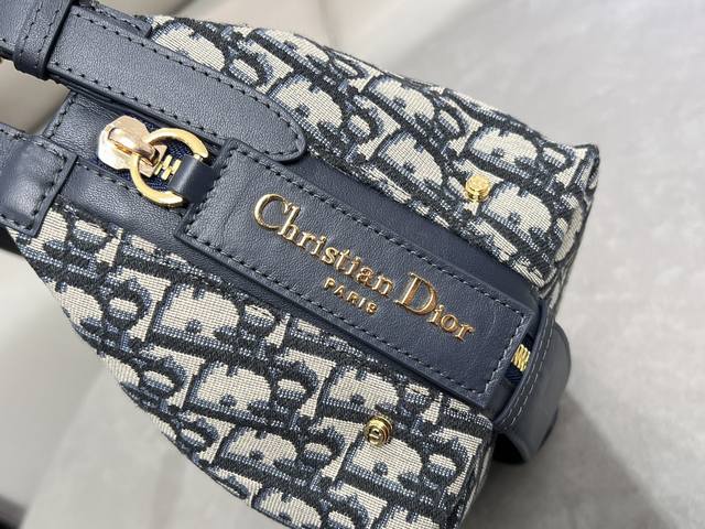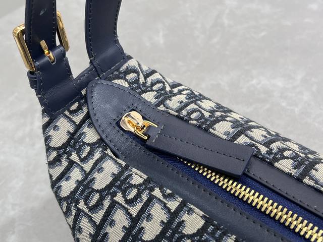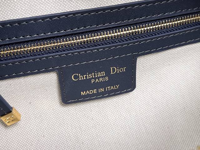 This D-Journey handbag is a new addition to the collection, making a stunning debut at the Dior Spring/Summer 2025 ready-to-wear show. Made of soft leather, it offers a modern interpretation of the dumpling bag silhouette. Crafted from blue calfskin, it features flat, oversized cannage stitching, a fresh take on Dior's classic pattern. The main compartment includes a zip pocket, while two side pockets feature large leather zipper pulls adorned with vintage gold-finished Christian Dior Paris logos, perfect for organizing small everyday essentials. The small size comes with an adjustable top handle and a leather shoulder strap, allowing for hand-carrying, shoulder-carrying, or crossbody wear
