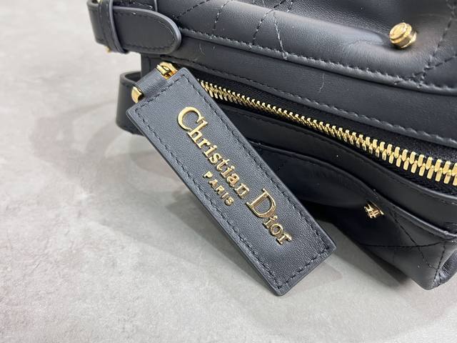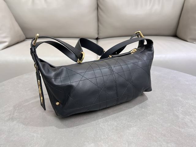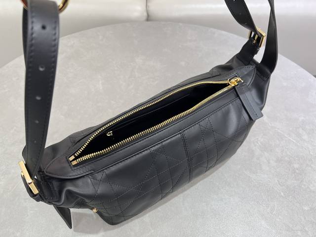 This D-Journey handbag is a new addition to the collection, making a stunning debut at the Dior Spring/Summer 2025 ready-to-wear show. Made of soft leather, it offers a modern interpretation of the dumpling bag silhouette. Crafted from smooth cowhide leather, it features flat, oversized cannage stitching, a fresh take on Dior's classic pattern. The main compartment includes a zip pocket, while two side pockets feature large leather zipper pulls adorned with vintage gold-finished Christian Dior Paris logos, perfect for organizing small everyday essentials. The small size comes with an adjustable top handle and a leather shoulder strap, allowing for hand-carrying, shoulder-carrying, or crossbody wear