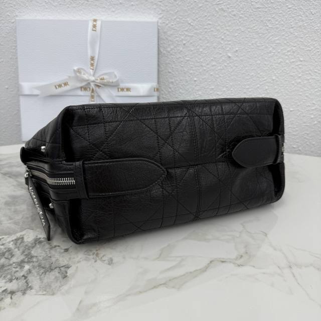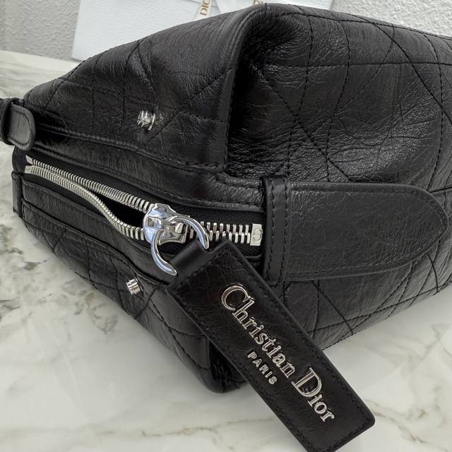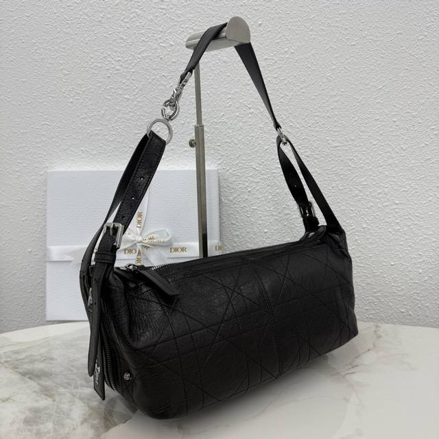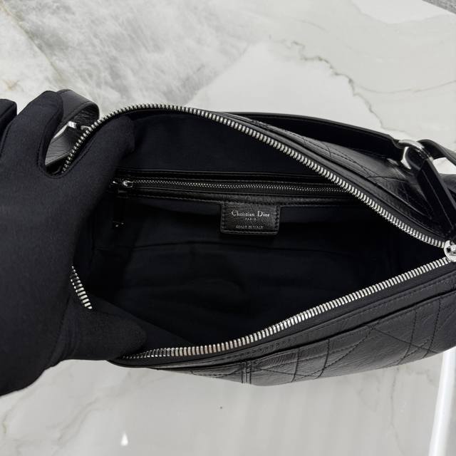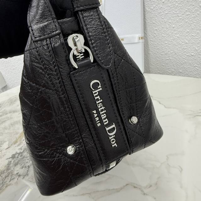This D-Journey handbag is a new addition to the collection, making a stunning debut at the Dior Spring/Summer 2025 ready-to-wear show. It features a soft texture and a modern interpretation of the dumpling bag silhouette. Crafted from waxed calfskin, it's adorned with flat, oversized cannage stitching, a fresh take on Dior's classic pattern. The main compartment includes a zip pocket, while two side pockets feature large leather zipper pulls adorned with a vintage stainless steel Christian Dior Paris logo, perfect for organizing small everyday essentials. The small size comes with an adjustable top handle and a leather shoulder strap, allowing for hand-carrying, shoulder-carrying, or crossbody wear