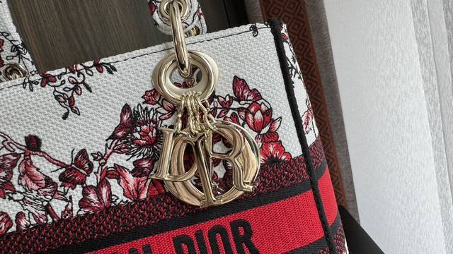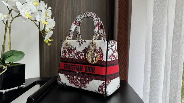 This Lady D-Lite handbag from Dior perfectly blends classic elegance with the brand's fashionable aesthetics. Paying homage to Dior's love and romance, it features the white and red Le Cur Des papillons pattern designed by pietro Ruffo, evoking the allure of bouquets and butterflies. The front is adorned with the Christian Dior Paris logo, complemented by a light gold-finished DIOR charm for added sophistication. The medium size comes with a detachable embroidered wide shoulder strap, allowing for hand-carrying or crossbody wear. Dimensions: 24 x 20 x 11 cm (Length x Height x Width).