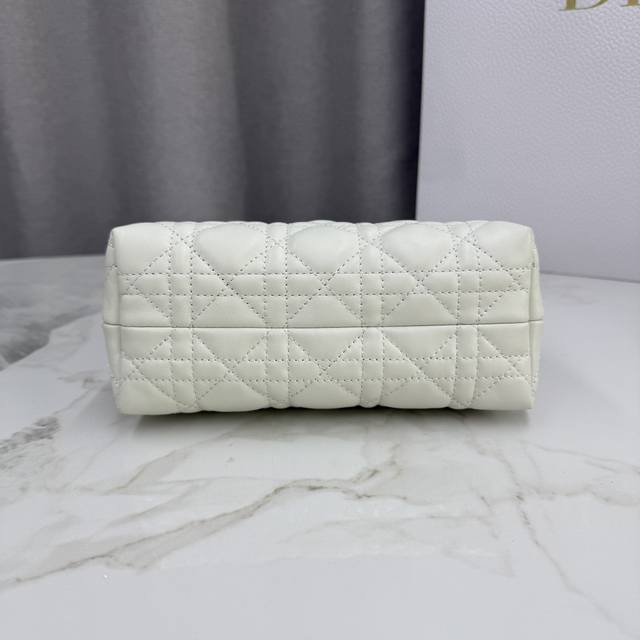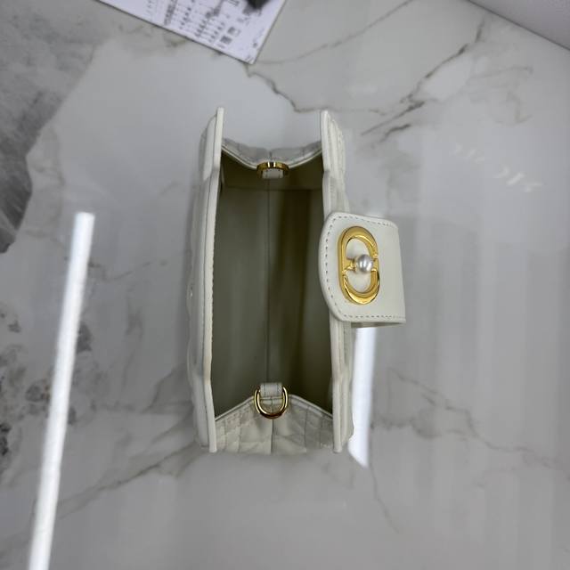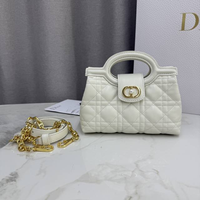 Top-grade original. This Dior Jolie Top Handle Mini Chain Bag, a new addition to the Cruise 2026 Ready-to-Wear collection, showcases an elegant and practical design. Crafted from white lambskin leather with a cannage pattern, its flap is embellished with a gold-finished metal CD signature and white resin beads. It features a single interior compartment for everyday essentials. Featuring double top handles and an adjustable and detachable CD chain shoulder strap comprised of leather straps and CD links embellished with white resin beads, it can be comfortably carried by hand, on the shoulder, or across the body, complementing both daytime and evening looks.