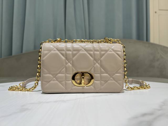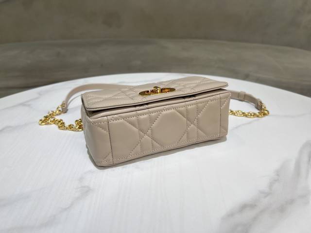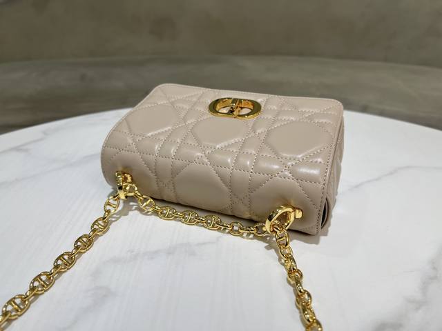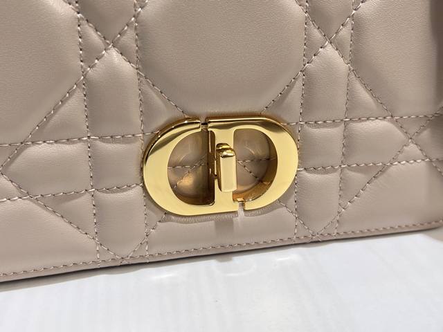 . This Soft Dior Caro handbag, a new addition to the Fall 2025 Ready-to-Wear collection, blends modern elegance with a soft silhouette. Crafted from luxurious apricot lambskin leather, it features oversized cane check stitching. The flap is adorned with a vintage gold-finish metal knob-style CD clasp, inspired by the closure of a Christian Dior perfume bottle. The small size features a detachable CD chain-link shoulder strap for hand-carrying, shoulder-carrying, or cross-body wear. It can also be replaced with a wide embroidered shoulder strap to enhance daytime or evening looks.