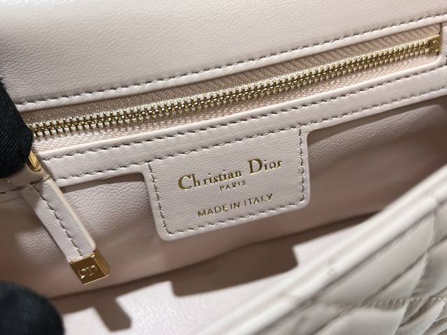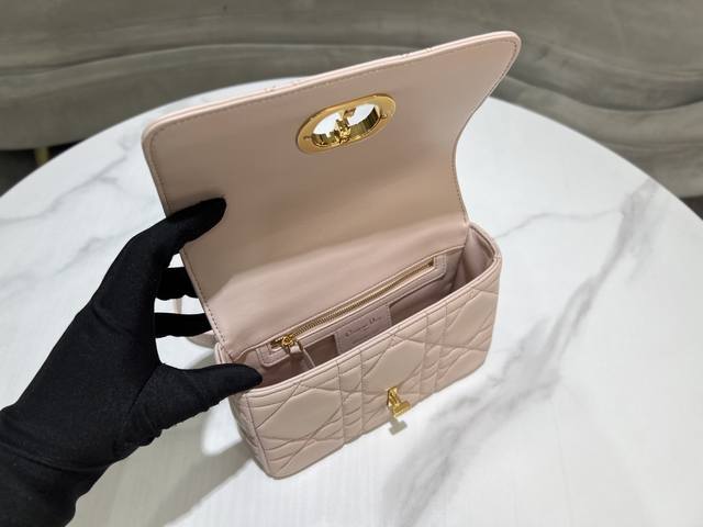 . This Soft Dior Caro handbag, a new addition to the Fall 2025 Ready-to-Wear collection, blends modern elegance with a soft silhouette. Crafted from luxurious pink lambskin leather, it features oversized cane check stitching. The flap is adorned with a vintage gold-finish metal knob-style CD clasp, inspired by the closure of a Christian Dior perfume bottle. The small size features a detachable CD chain-link shoulder strap for hand-carrying, shoulder-carrying, or cross-body wear. It can also be replaced with a wide embroidered strap to enhance daytime or evening looks.