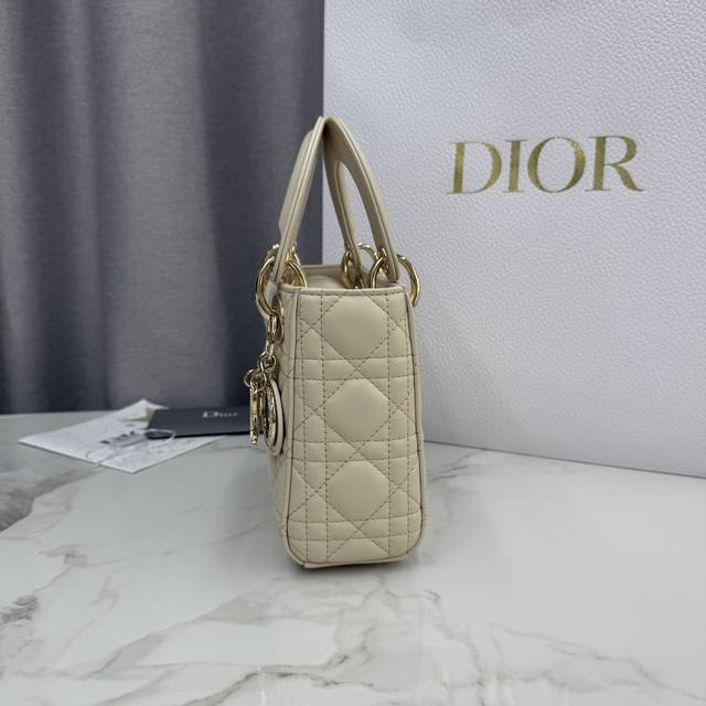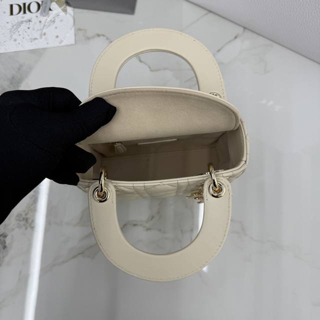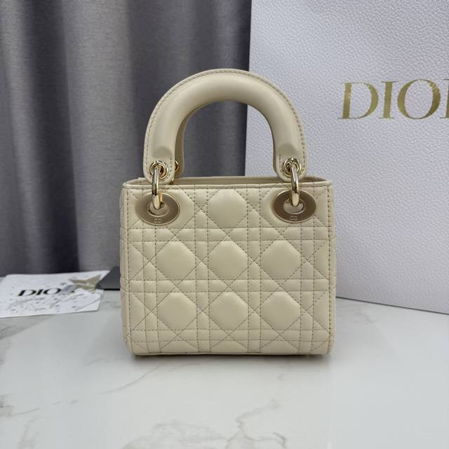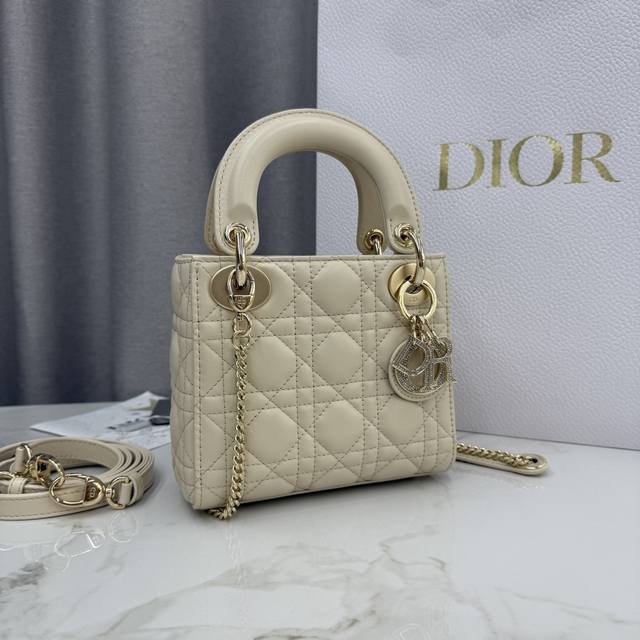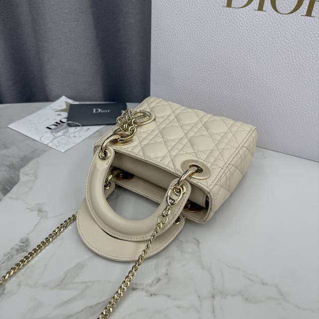 Top-quality original single-compartment ivory white lambskin diamond buckle Lady Dior bag - Item No.: M0505 DDD This Lady Dior handbag embodies Dior's profound insight into elegance and beauty. Crafted from ivory white lambskin, it features a classic and striking quilted texture with cannage stitching, a timelessly chic and elegant design. Adorned with a diamond-finished DIOR charm, it adds a touch of dynamism to its exquisite silhouette. The mini version, with a detachable chain shoulder strap, can be carried by hand or crossbody, making it the perfect companion for evening wear. DDD Body: Lambskin leather DDD Lining: Lambskin leather DDD Detachable chain DDD Internal zippered pocket DDD Can be paired with other Dior embroidered shoulder strap DDD Includes dust bag DDD Dimensions: 17 x 15 x 7 cm (L x H x W) DDD Can hold 1 mobile phone, 1 card holder, and lipstick DDD Chain length: 120 cm DDD Length from chain top to bag top: 58 cm DDD Top handle length: 24 cm DDD Length from top handle top to bag top: 6.5 cm DDD Weight: 700 grams DDD Size and weight details may vary depending on the product materials DDD