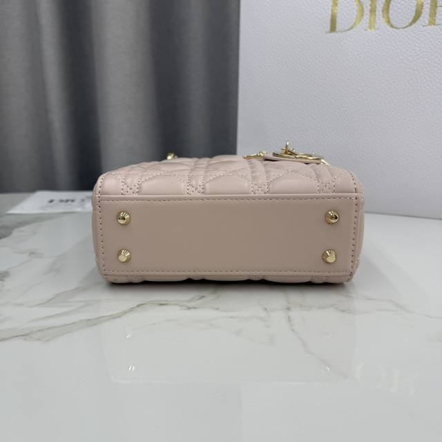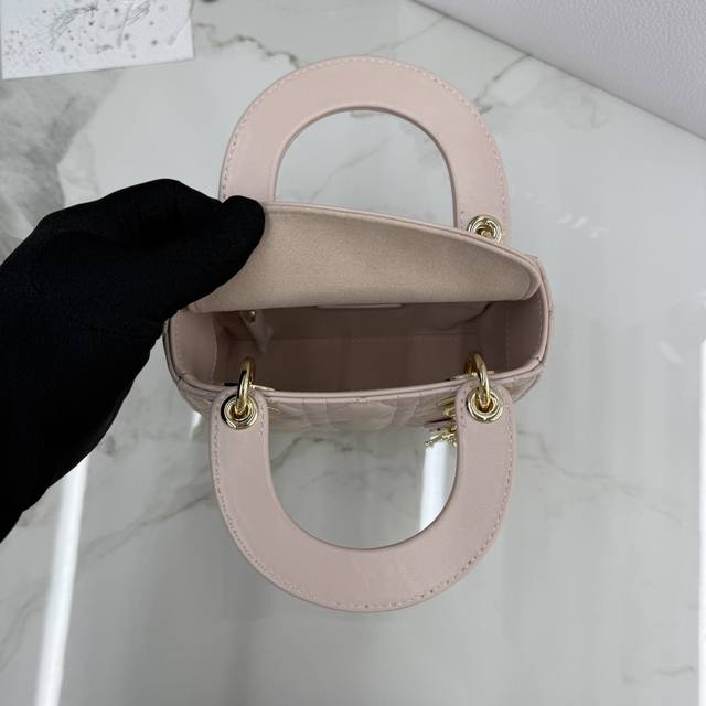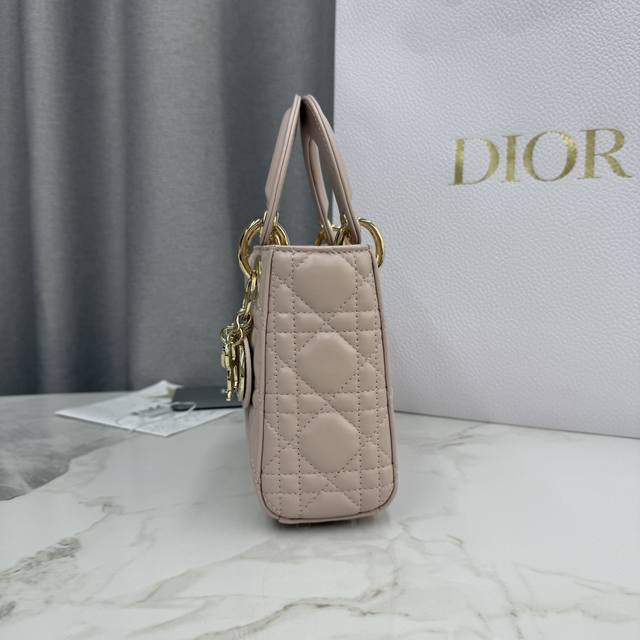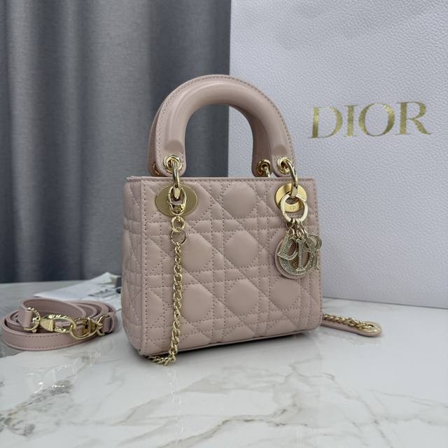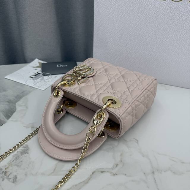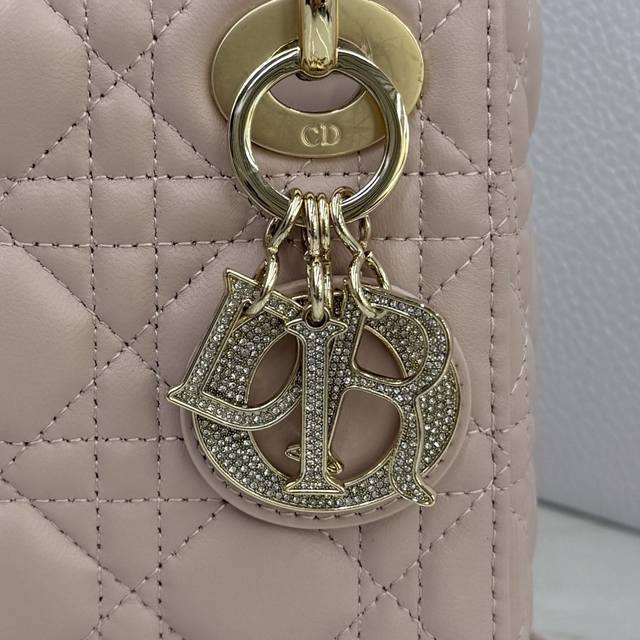 Top-quality original single-compartment Lady Dior bag in blush pink lambskin with diamond buckle - Item No.: M0505 DDD This Lady Dior handbag embodies Dior's profound insight into elegance and beauty. Crafted from blush pink lambskin, it features a classic and striking quilted texture with cannage stitching, a timelessly chic and elegant design. Adorned with a diamond-set DIOR charm, it adds a touch of dynamism to its exquisite silhouette. The mini version, with a detachable chain shoulder strap, can be carried by hand or crossbody, making it the perfect companion for evening wear. DDD Body: Lambskin leather DDD Lining: Lambskin leather DDD Detachable chain DDD Internal zippered pocket DDD Can be paired with other Dior embroidered shoulder strap DDD Includes dust bag DDD Dimensions: 17 x 15 x 7 cm (L x H x W) DDD Can hold 1 mobile phone, 1 card holder, and lipstick DDD Chain length: 120 cm DDD Length from chain top to bag top: 58 cm DDD Top handle length: 24 cm DDD Length from top handle top to bag top: 6.5 cm DDD Weight: 700 grams DDD Size and weight details may vary depending on the product materials DDD