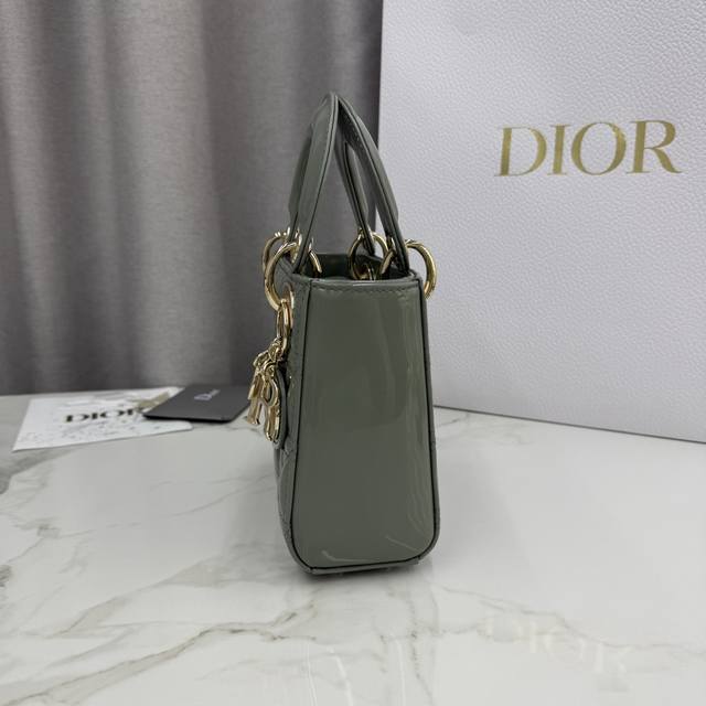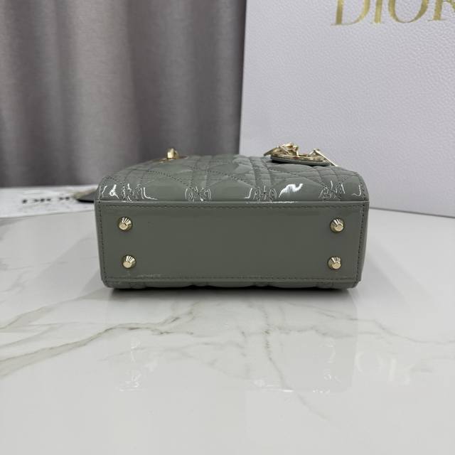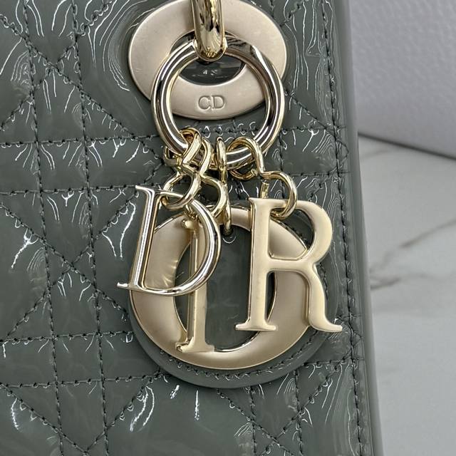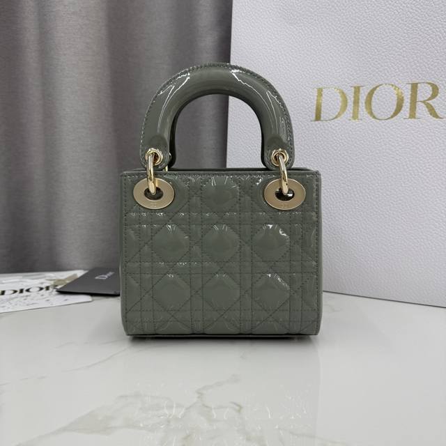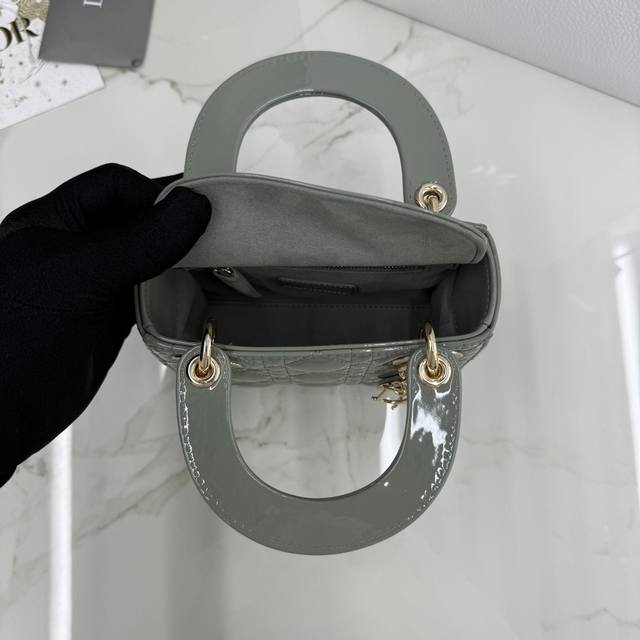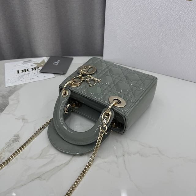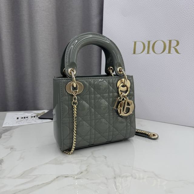 Top-quality original single-compartment rock grey patent leather Lady Dior bag with gold hardware - Item No.: M0505 DDD This Lady Dior handbag embodies Dior's profound insight into elegance and beauty. Crafted from rock grey patent leather calfskin, it features a classic and striking quilted texture with cannage stitching, a timelessly chic and elegant design. Adorned with a light gold-finished DIOR charm, it adds a touch of dynamism to its exquisite silhouette. The mini version, with a detachable chain shoulder strap, can be carried by hand or crossbody, making it the perfect companion for evening wear. DDD Body: Cowhide leather DDD Lining: Sheepskin leather, cow leather DDD Detachable chain DDD Internal zippered pocket DDD Can be paired with other Dior embroidered shoulder strap DDD Includes dust bag DDD Made in Italy or France *This product is produced in multiple countries. Please see the product label for the actual country of origin of the product you purchase. DDD Dimensions: 17 x 15 x 7 cm (L x H x W) DDD Can hold 1 mobile phone, 1 card holder, and lipstick DDD Chain length: 120 cm DDD Chain top to bag top length: 58 cm DDD Top handle length: 24 cm DDD Top handle top to bag top length: 6.5 cm DDD Weight: 700 grams DDD Size and weight details may vary depending on the product materials DDD