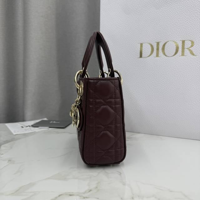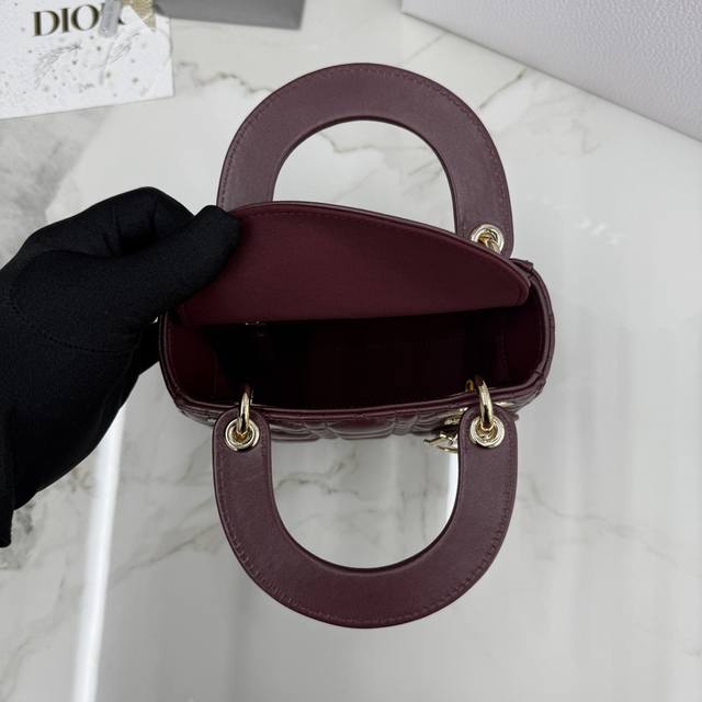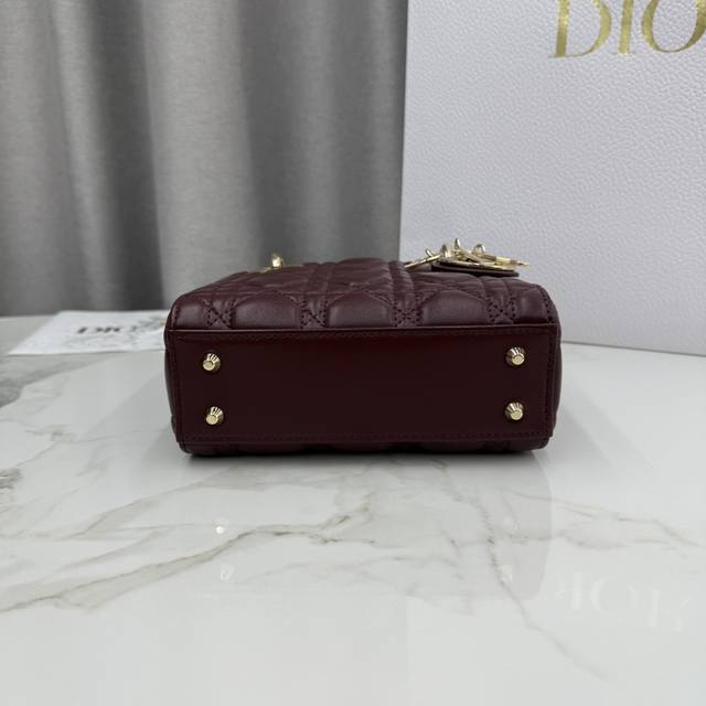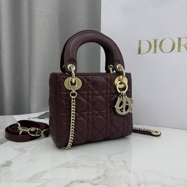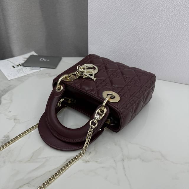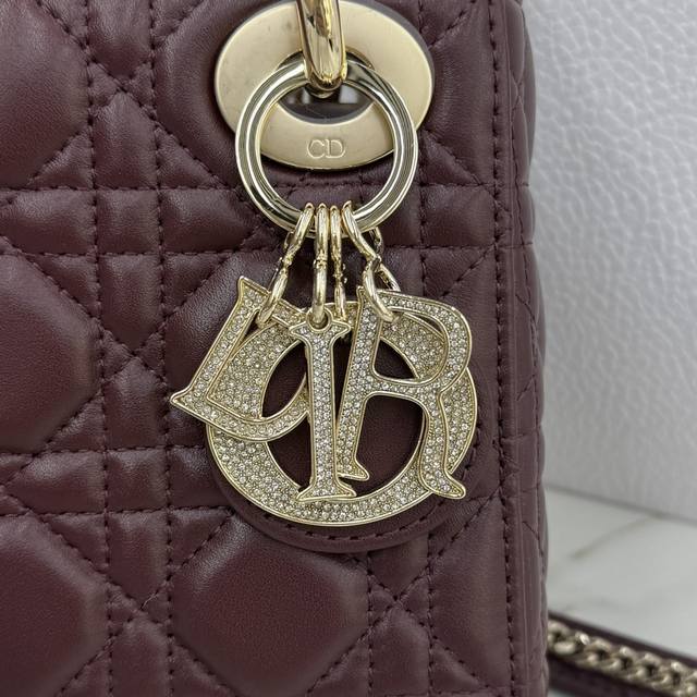 Top-quality original three-compartment burgundy lambskin diamond buckle Lady Dior bag - Item No.: M0505 DDD This Lady Dior handbag embodies Dior's profound insight into elegance and beauty. Crafted from burgundy lambskin, it features a classic and striking quilted texture with cannage stitching, a timelessly chic and elegant design. Adorned with a diamond-set DIOR charm, it adds a touch of dynamism to its exquisite silhouette. The mini version, with a detachable chain shoulder strap, can be carried by hand or crossbody, making it the perfect companion for evening wear. DDD Body: Lambskin leather DDD Lining: Lambskin leather DDD Detachable chain DDD Internal zippered pocket DDD Can be paired with other Dior embroidered shoulder strap DDD Includes dust bag DDD Dimensions: 17 x 15 x 7 cm (L x H x W) DDD Can hold 1 mobile phone, 1 card holder, and lipstick DDD Chain length: 120 cm DDD Length from chain top to bag top: 58 cm DDD Top handle length: 24 cm DDD Length from top handle top to bag top: 6.5 cm DDD Weight: 700 grams DDD Size and weight details may vary depending on the product materials DDD