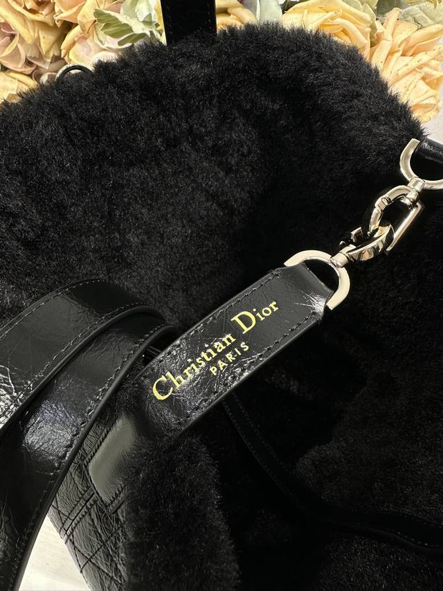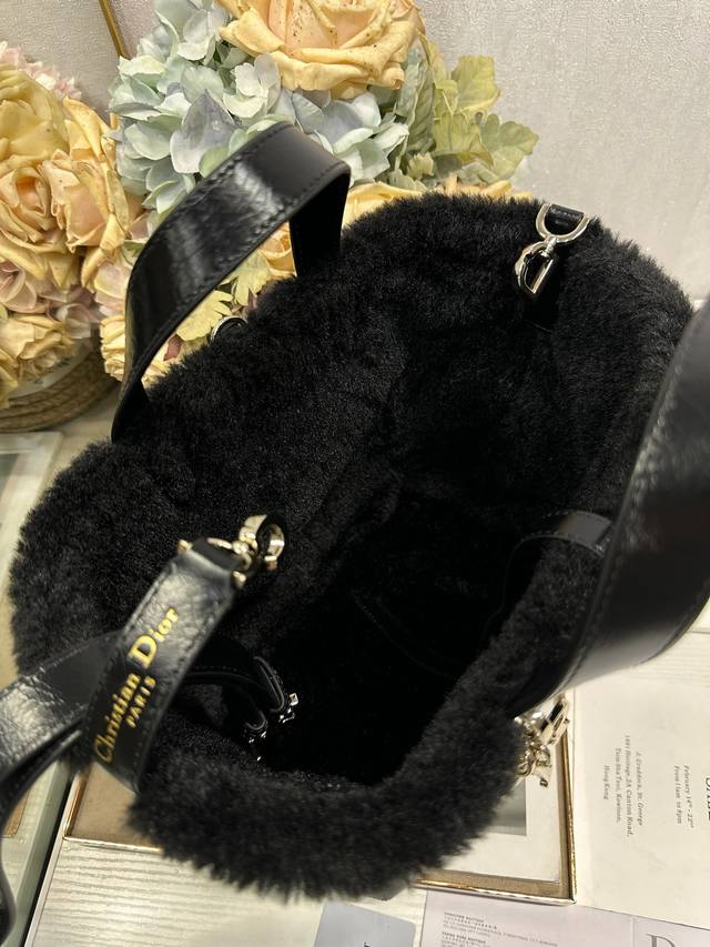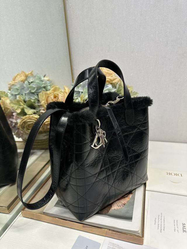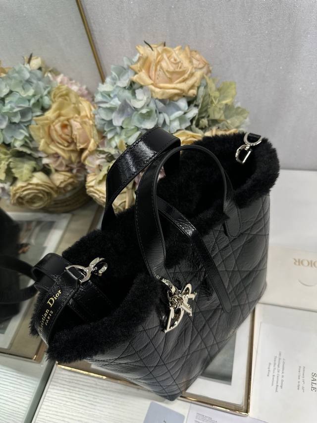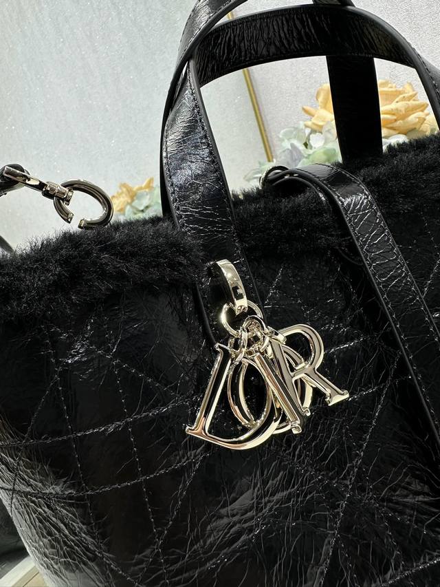 Top-tier original Dioralps Medium Dior Toujours Vertical Handbag, Cracked Black with Black Fur Trim DDD This Dior Toujours vertical handbag is from the Dioralps limited edition collection, stylish, practical, and unique. Crafted from black distressed lambskin and other materials, it features oversized cannage stitching and black fur trim, showcasing Dior's exceptional craftsmanship. The spacious interior compartments can hold various everyday essentials. It features a slim leather strap closure for secure storage, and a Cd Lock D-shaped knob buckle for adjustable sides to accentuate the silhouette. The medium size includes a leather top handle and a detachable leather shoulder strap, allowing for hand-carrying, shoulder-carrying, or crossbody wear. It can also be easily paired with other Dioralps items to create coordinated looks. Double closure design: slim strap and Christian Dior Paris strap with Cd Lock buckle. DIOR charm. Internal slip pocket for cards. Leather top handle. Detachable leather shoulder strap. Model: 2836. Dimensions: 23 x 24 x 16 cm (L x H x W). Holds 2 wallets, 1 cell phone, 2 cardholders, sunglasses, and lipstick.