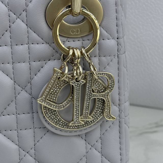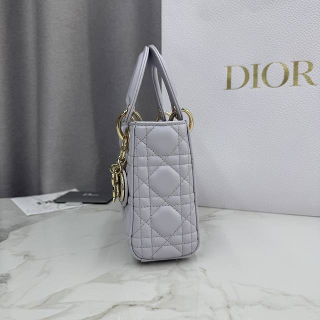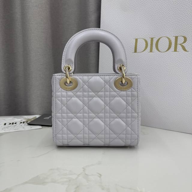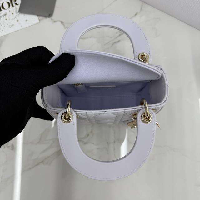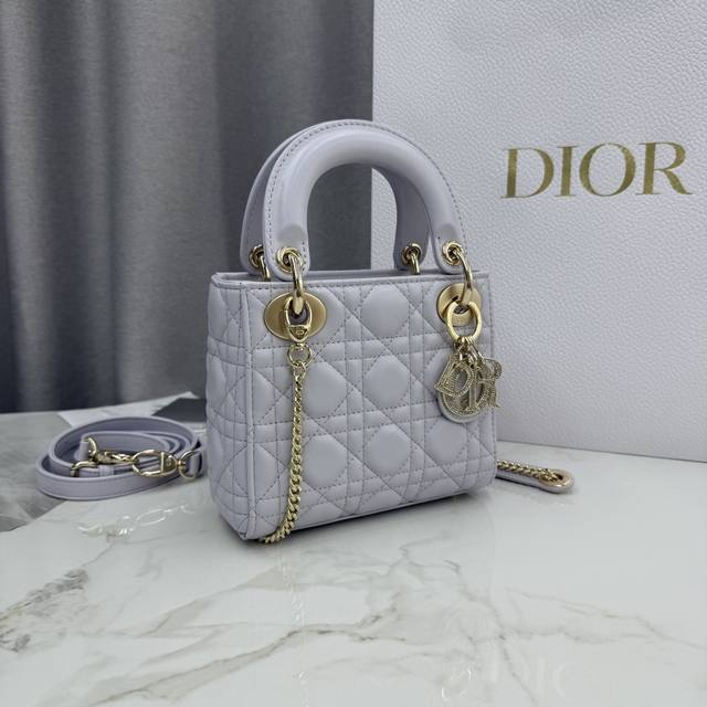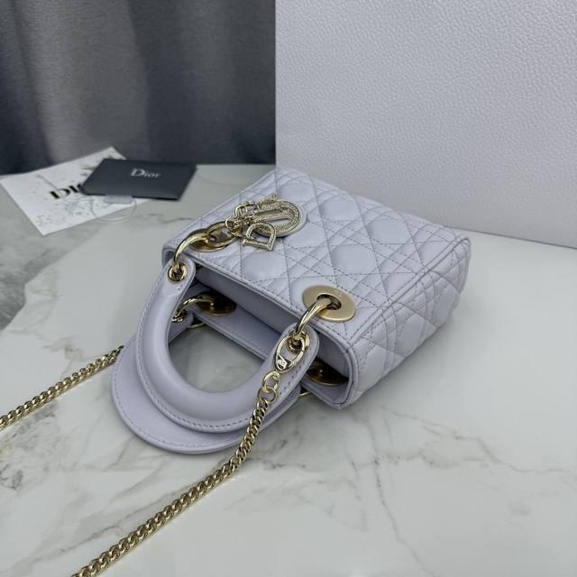 Top-Tier Original Three-Compartment Dreamy Purple Lambskin Diamond Buckle Lady Dior Bag - Item No.: M0505 DDD This Lady Dior handbag embodies Dior's profound insight into elegance and beauty. Crafted from dreamy purple lambskin leather, it features a classic and striking quilted texture with cannage stitching, a timelessly chic and elegant design. Adorned with a diamond-set DIOR charm, it adds a touch of dynamism to its exquisite silhouette. The mini version, with a detachable chain shoulder strap, can be carried by hand or crossbody, making it the perfect companion for evening wear. DDD Body: Lambskin leather DDD Lining: Lambskin leather DDD Detachable chain DDD Internal zippered pocket DDD Can be paired with other Dior embroidered shoulder strap DDD Includes dust bag DDD Dimensions: 17 x 15 x 7 cm (L x H x W) DDD Can hold 1 mobile phone, 1 card holder, and lipstick DDD Chain length: 120 cm DDD Length from chain top to bag top: 58 cm DDD Top handle length: 24 cm DDD Length from top handle top to bag top: 6.5 cm DDD Weight: 700 grams DDD Size and weight details may vary depending on the product materials DDD