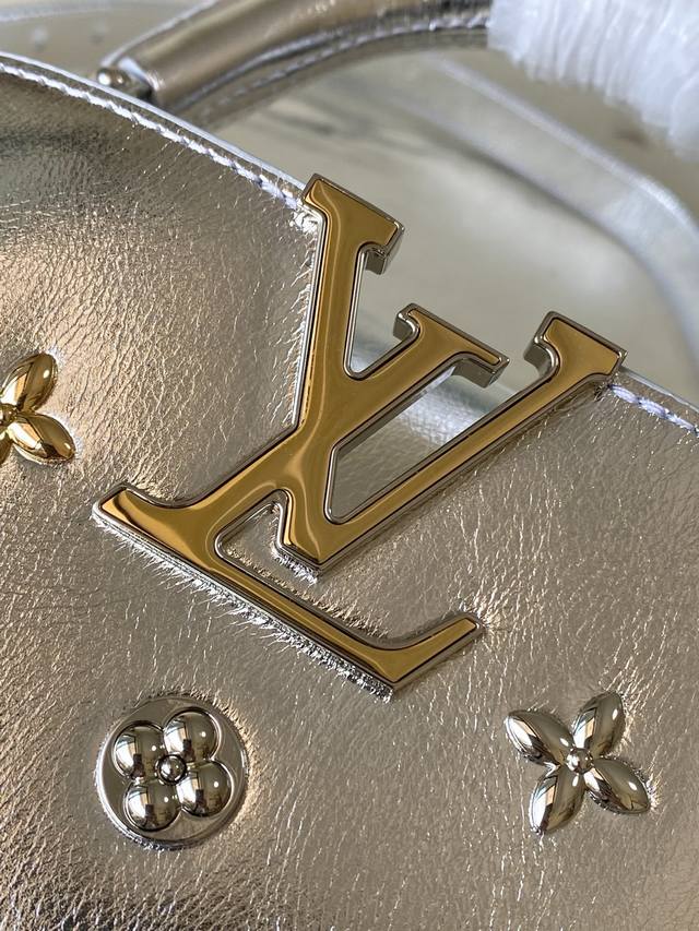 Factory Price p Premium Original Leather M26258 Silver Starry Sky Mini Capucines handbag. This Capucines handbag is made of Silver leather and features futuristic Monogram Miroir elements, adding a futuristic touch to the Star Shapes series. Metal studs outline the brand's classic pattern. The flap can be opened to reveal a convenient space for storing a phone, wallet, keys, and other personal items. Size: 21 * 14 * 8 cm DDD