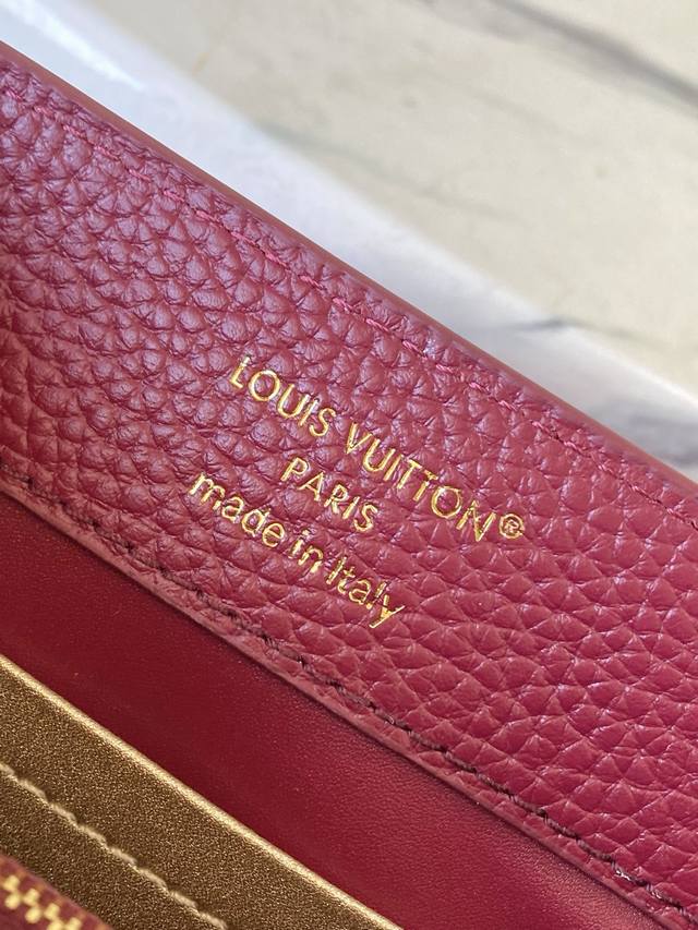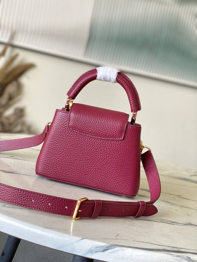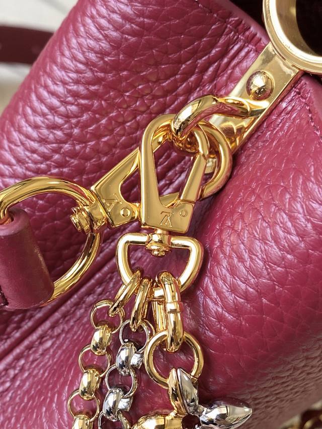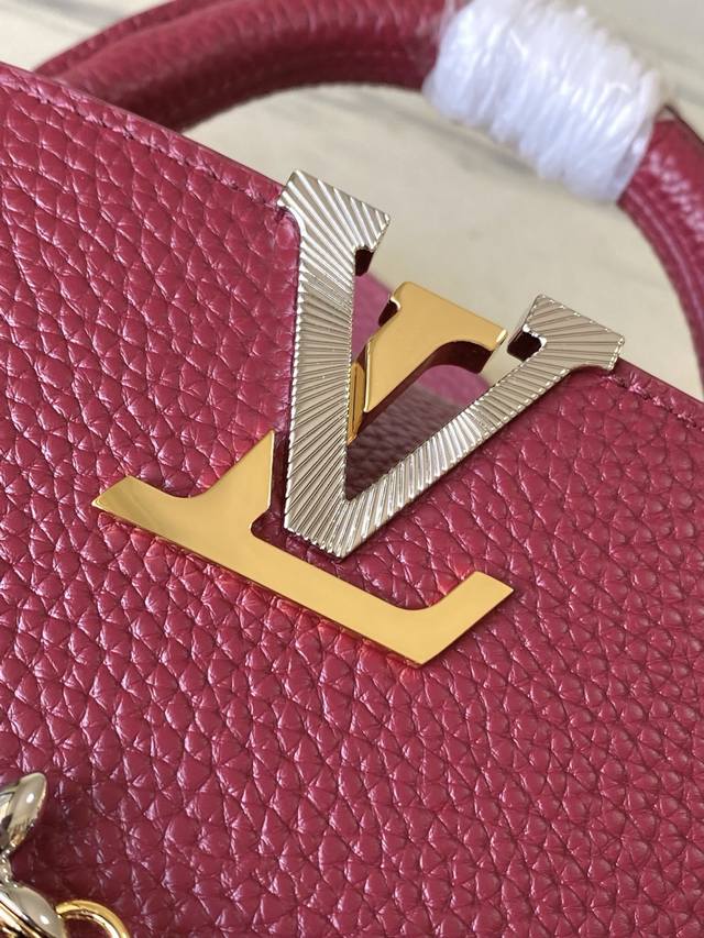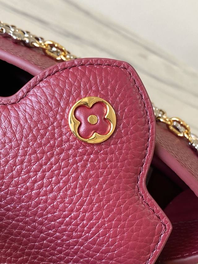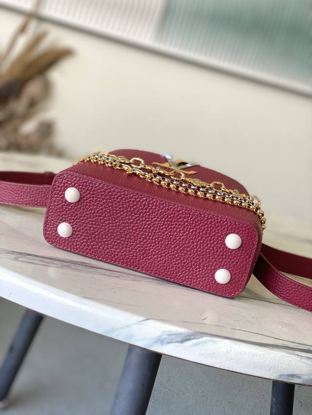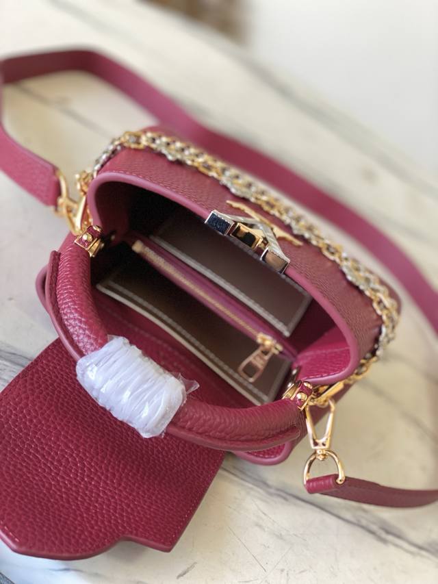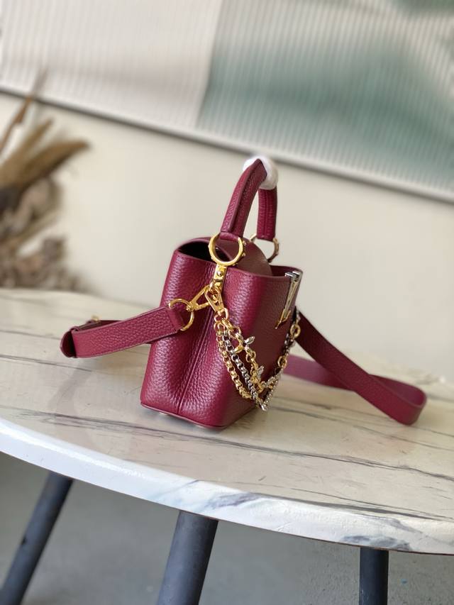 Factory Price p Premium Original Leather M27034 M48865 Burgundy Mini Capucines features a striking, sophisticated jewel-toned version adorned with the brand's double-galvanized Infinity chain crafted from Taurillon leather and embellished with the iconic Monogram floral pattern and LV initials. These logos are treated with a unique radiating effect. This dual-carry style includes an internal flat pocket and offers multiple wearing options. Size: 21 * 14 * 8 cm DDD