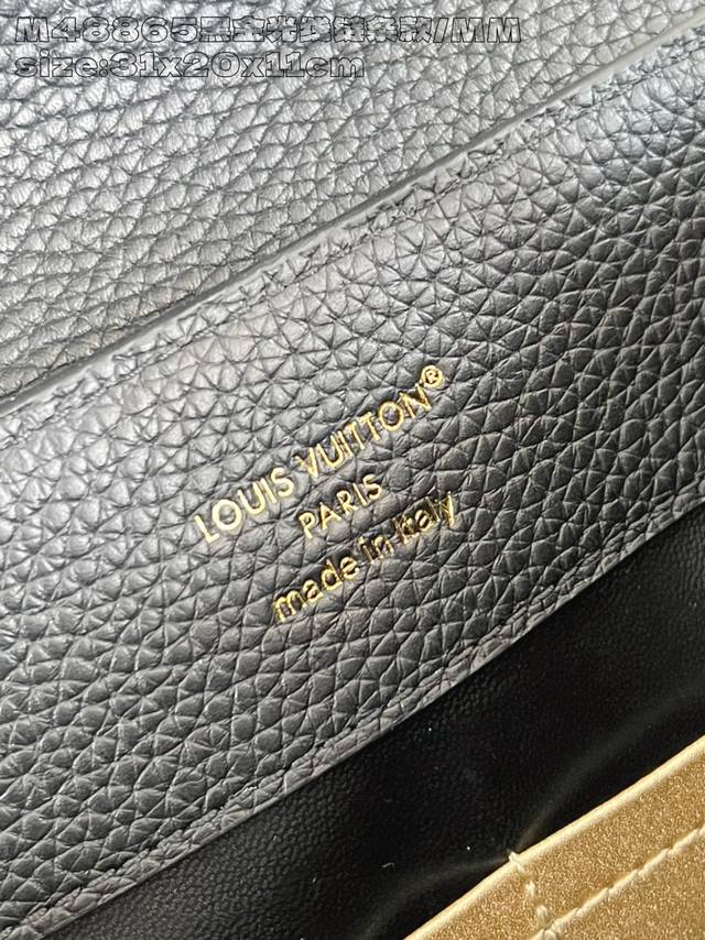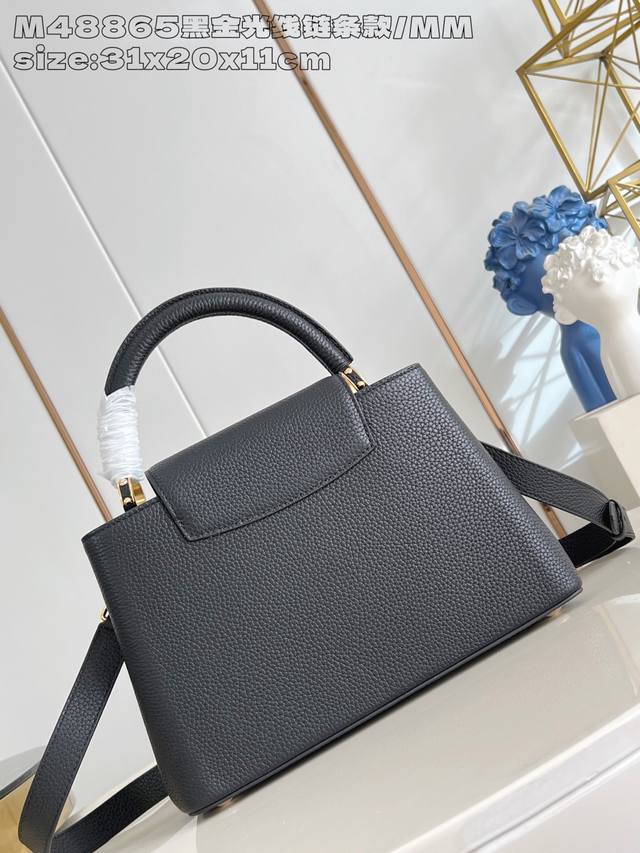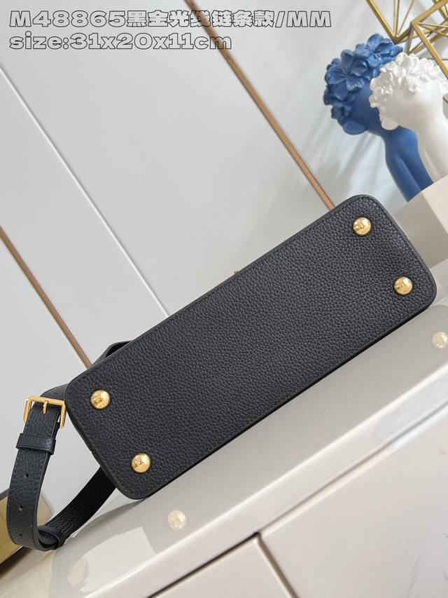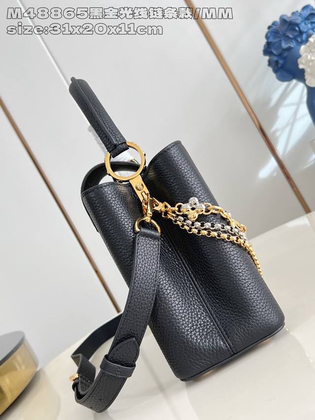 Factory Price p Top-Tier Original M48865 Black Gold Radiant Chain Medium This modern Capucines Mm is crafted from timeless black Taurillon leather and features a jewelry-inspired Infinity chain. The bag is adorned with double-galvanized metal hardware, including the iconic Monogram floral pattern and the LV Initials logo crafted with a sunburst finish, creating a sundial-like light and shadow effect. The bag has multiple pockets and a detachable shoulder strap, offering both shoulder and crossbody carrying options. 31.5X20X11Cm DDD