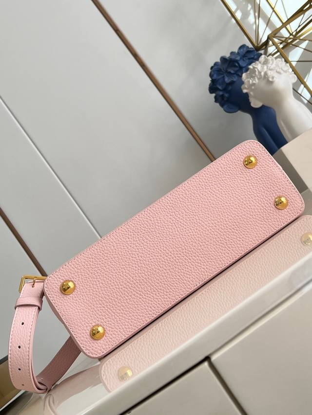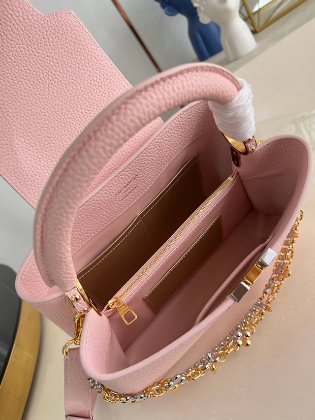 Factory Price p Top-Tier Original M48865 Pink Thread Chain Medium This modern Capucines Mm is crafted from timeless black Taurillon leather and features a jewelry-inspired Infinity chain. The bag is adorned with double-galvanized metal hardware, including the iconic Monogram floral pattern and the LV Initials logo crafted with a sunburst finish, creating a sundial-like light and shadow effect. The bag has multiple pockets and a detachable shoulder strap, offering both shoulder and crossbody carrying options. 31.5X20X11Cm DDD