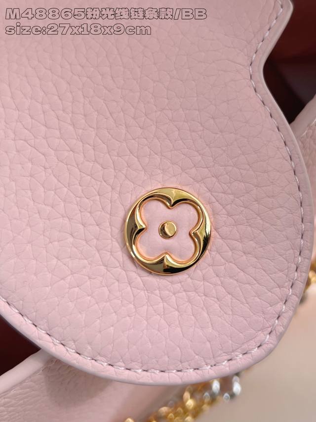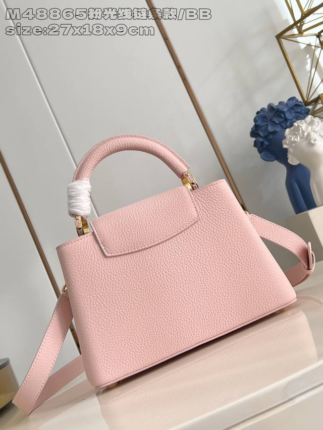Factory Price p Top-Tier Original M48865 Pink Thread Chain Small M27039 This modern Capucines BB is crafted from timeless black Taurillon leather and features a jewelry-inspired Infinity chain. The bag is adorned with double-galvanized metal hardware, including the iconic Monogram floral pattern and the LV Initials logo crafted with a sunburst finish, creating a sundial-like light and shadow effect. The bag has multiple pockets and a detachable shoulder strap, offering both shoulder and crossbody carrying options. 27 x 17.3 x 9 cm Length x Height x Width DDD