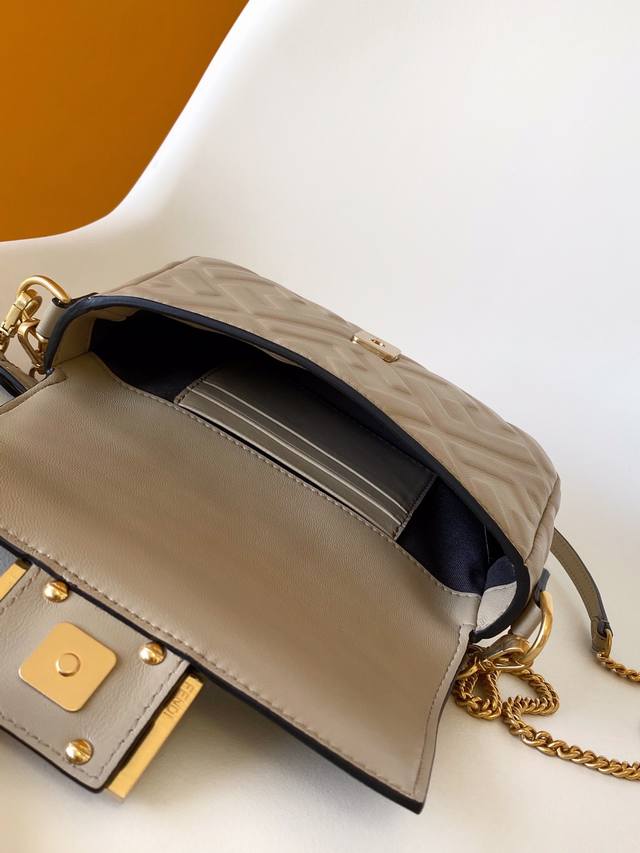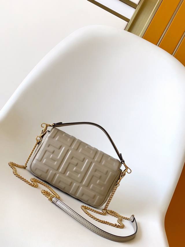 Fend Baguette Small Crossbody Bag. Made of imported 3D textured lambskin, featuring a full Ff pattern, gold-tone vintage metal hardware, a flap design with Ff magnetic closure, and comes with an adjustable and detachable chain strap and leather wrist strap. Small size: 19*3*11. Style number: 212.