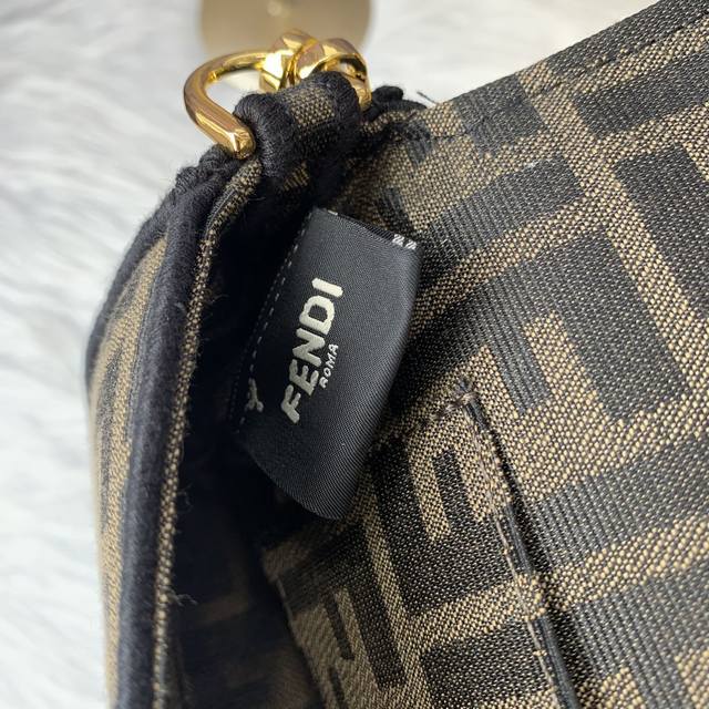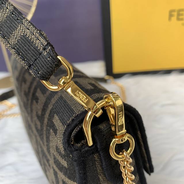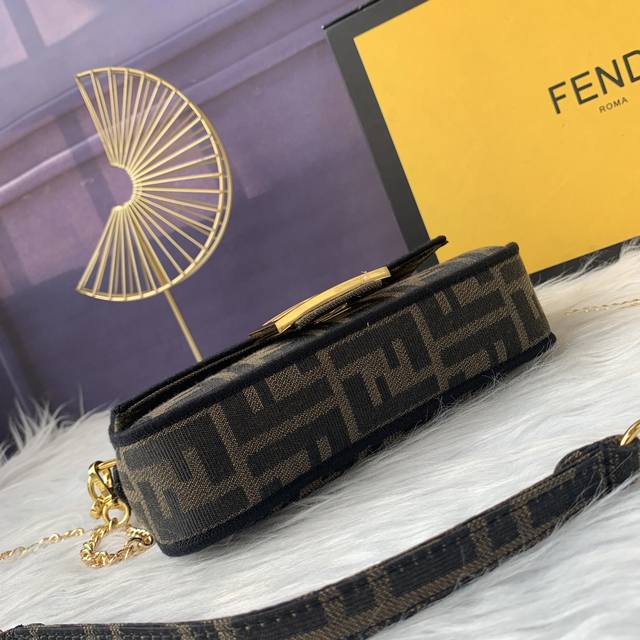 Fendi F8Bs018# The iconic Baguette mini bag features a flap and a Ff magnetic clasp. It comes with an adjustable and detachable long chain and a leather shoulder strap. Made of mirrored gold-pink leather with an all-over Ff motif. Dimensions: 19 x 11.5 x 4 cm.