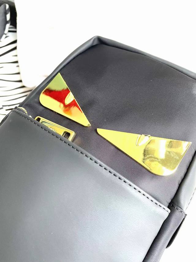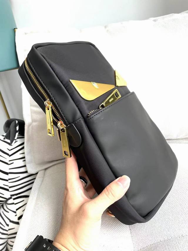 Fendi Monster Rectangular Backpack for Men, Crossbody/Chest Bag. Made with original technical fabric and imported suede cowhide, this bag offers an excellent travel experience. It features two compartments and a practical nylon shoulder strap that is adjustable and can be fastened on either the left or right side. The exterior pocket and main compartment have coated waterproof zippers. It also includes two interior pockets. The back is made of breathable technical mesh fabric. Dimensions: 30-17-6cm. Made in Italy. Model 2330# Golden Eye