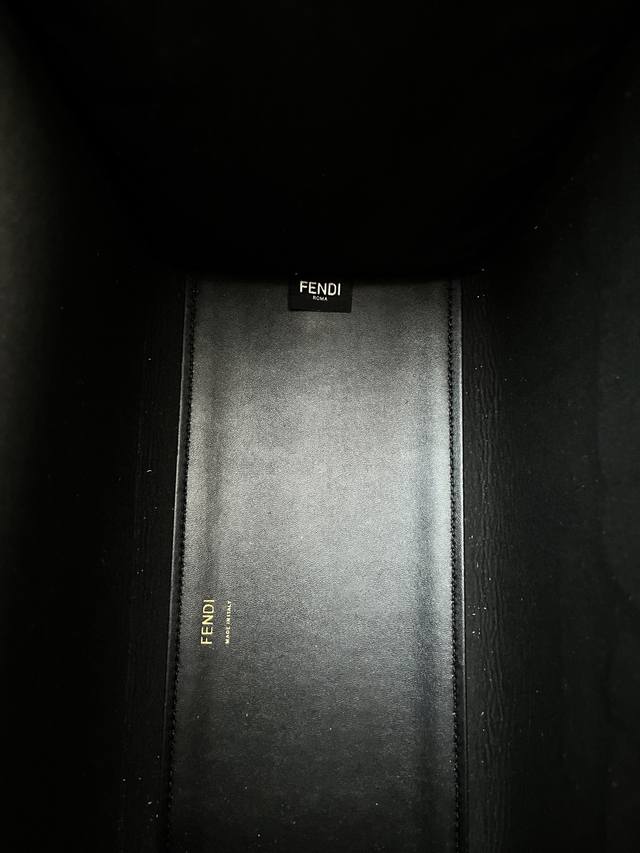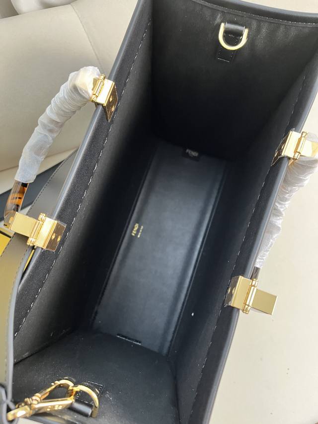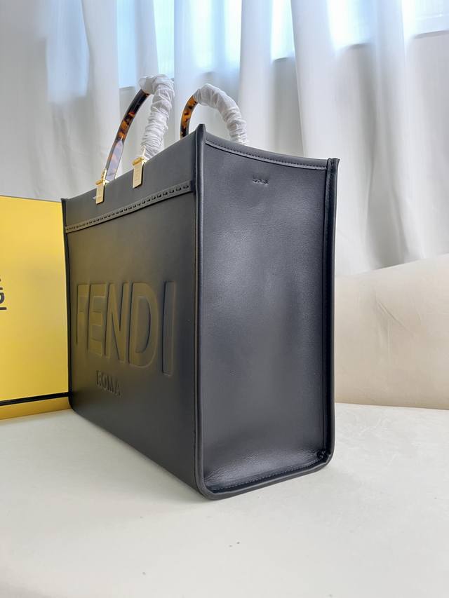 Authentic Fendi Medium Sunshine Shopping Tote Bag (Black) More details: This Fendi Medium Sunshine tote bag features embossed Fendi Roma lettering and hard tortoiseshell-effect acrylic handles. It boasts a spacious, lined interior with matching leather trim and gold-tone hardware. It includes two handles and a detachable shoulder strap for hand or shoulder carrying. Made in Italy. Material: Outer fabric: cowhide leather, lining: synthetic leather. Dimensions: 17 x 35 x 31 cm. Style number: 877.