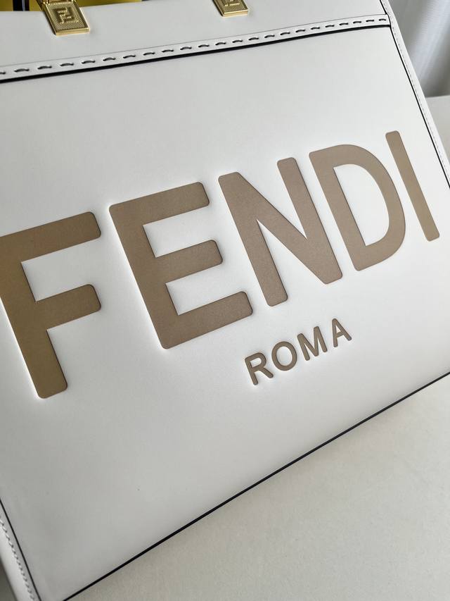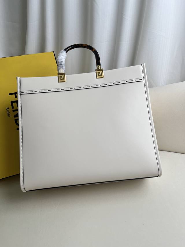 Authentic Fendi Medium Sunshine Shopping Tote Bag (White) More details: This Fendi Medium Sunshine tote bag features embossed Fendi Roma lettering and hard tortoiseshell-effect acrylic handles. It boasts a spacious, lined interior with matching leather trim and gold-tone hardware. It includes two handles and a detachable shoulder strap for hand or shoulder carrying. Made in Italy. Material: Outer fabric: cowhide leather, lining: synthetic leather. Dimensions: 17 x 35 x 31 cm. Style number: 877.