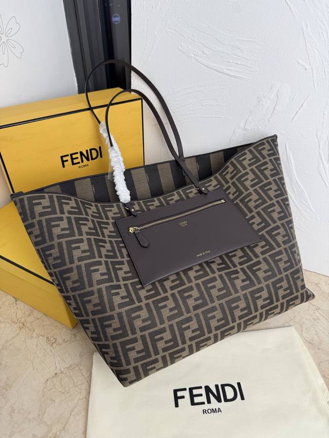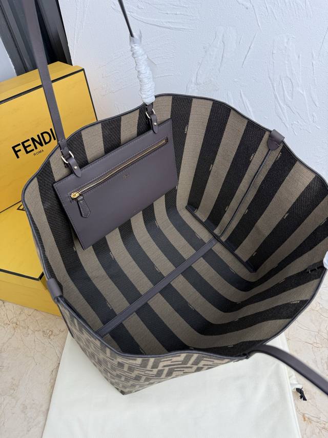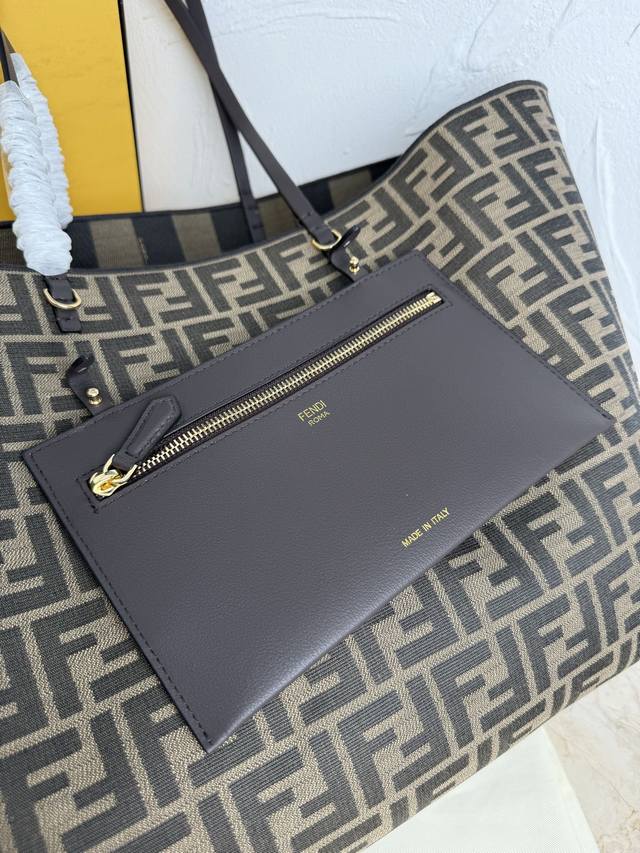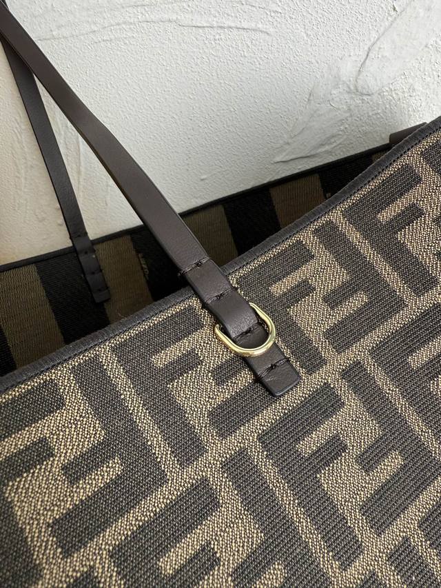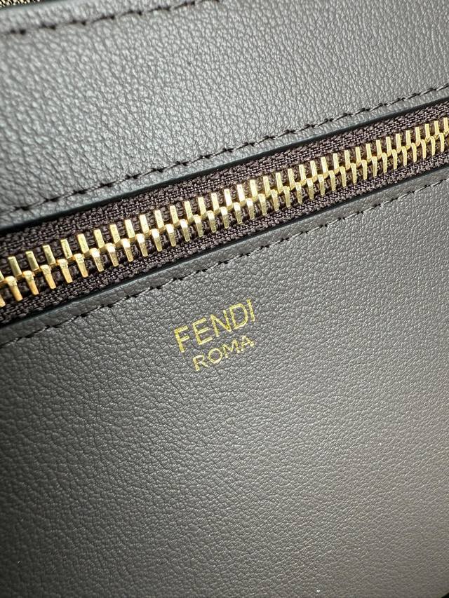 features brown calfskin handles for hand or shoulder carrying, adorned with large hand-stitched topstitching, representing the classic Selleria craftsmanship passed down through generations of Fendi artisans since 1925. Made in Italy. Made in Italy
