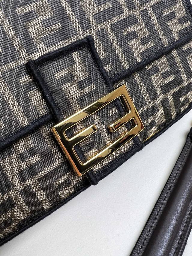 Authentic Medium Baguette Handbag, Brown Fabric. More details: This Iconic Baguette medium handbag is made of brown jacquard fabric with an Ff pattern, Ff clasp, and black embroidered trim. It features a front flap, magnetic closure, zip pocket, unlined interior compartment, and gold-tone hardware. The bag comes with a detachable handle and a Fendi Label-patterned shoulder strap, allowing it to be carried by hand, over the shoulder, or crossbody. Made in Italy. Material: Fabric (excluding coating), Lining: Fabric. Depth: 6mm. Length: 27mm. Height: 15mm. Style Number: 103.