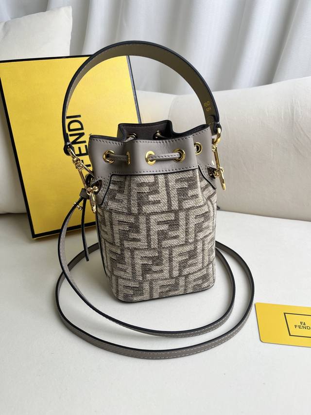 Authentic Mon Tresor Mini Handbag in Dove Grey Canvas and Light Blue Leather. More details: This Mon Tresor small bucket bag features a drawstring and Fendi metal logo trim. It comes with two detachable shoulder straps (one long, one short) for hand-carrying, shoulder-carrying, or crossbody wear. Made of light blue calfskin. Features a black hand-painted embossed Fendi signature print. Gold-tone hardware. Made in Italy. Material: Outer fabric: cowhide leather; Lining: fabric. Depth: 10mm; Length: 12mm; Height: 18mm. Style number: 226.