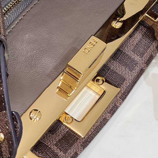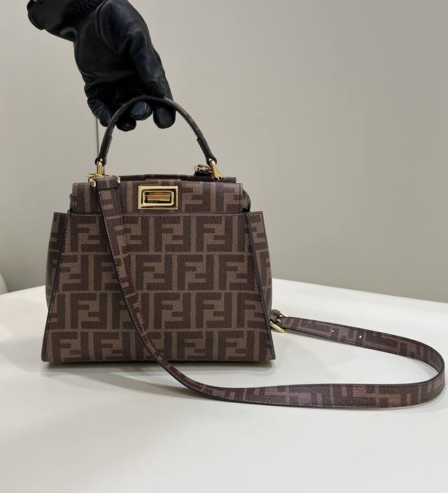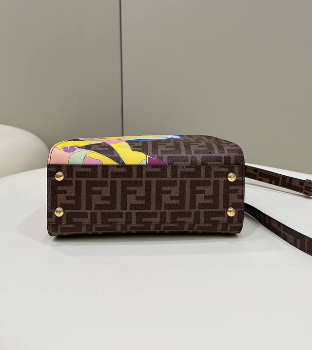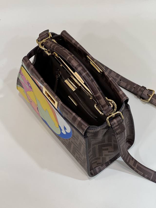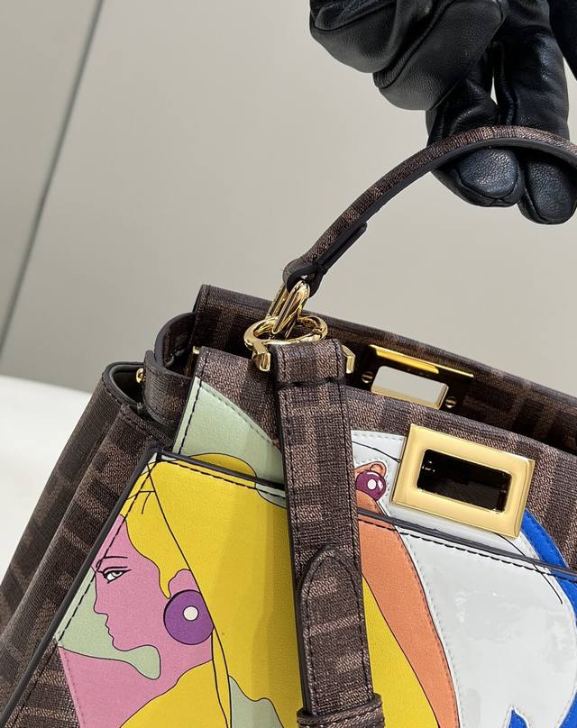 peekaboo Small glazed fabric bag, printed with the Ff motif and embellished with a color-blocked hand-applied leather illustration. This vibrant and dynamic pattern embodies the free femininity that distinguishes the Fendi spirit. Lined in soft nappa leather, it features two interior compartments with zippered pockets and gold-tone hardware. Equipped with a handle and an adjustable, detachable shoulder strap, it can be carried by hand, on the shoulder, or across the body. Style number: 244