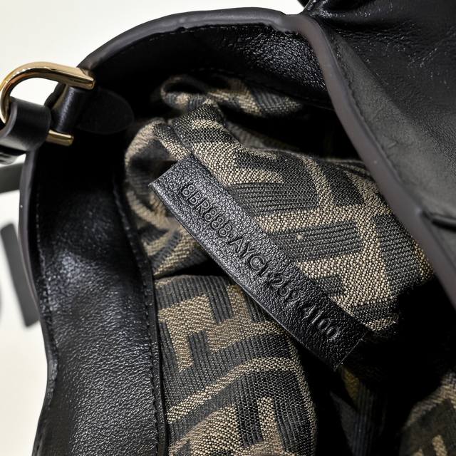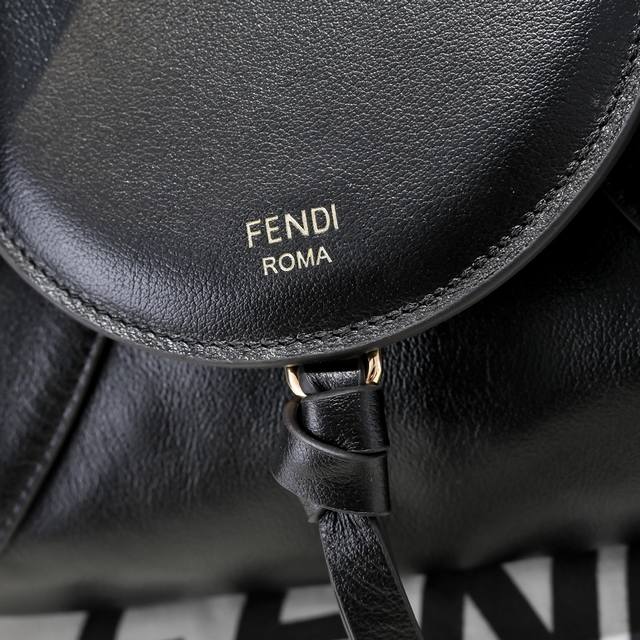 The round flap opening design hides a coin pocket, with metal trim design and a knotted leather shoulder strap in the same color. Gold hot stamping Fendi Roma logo.